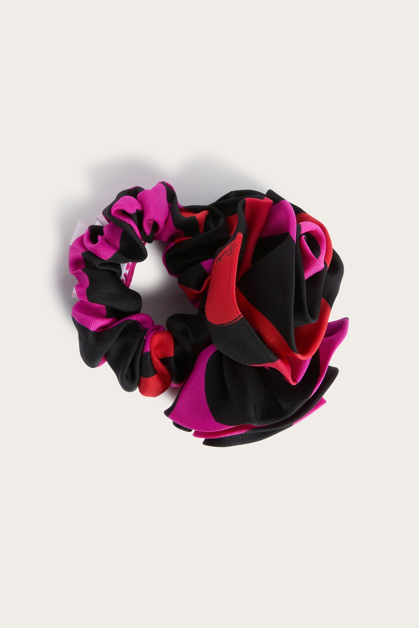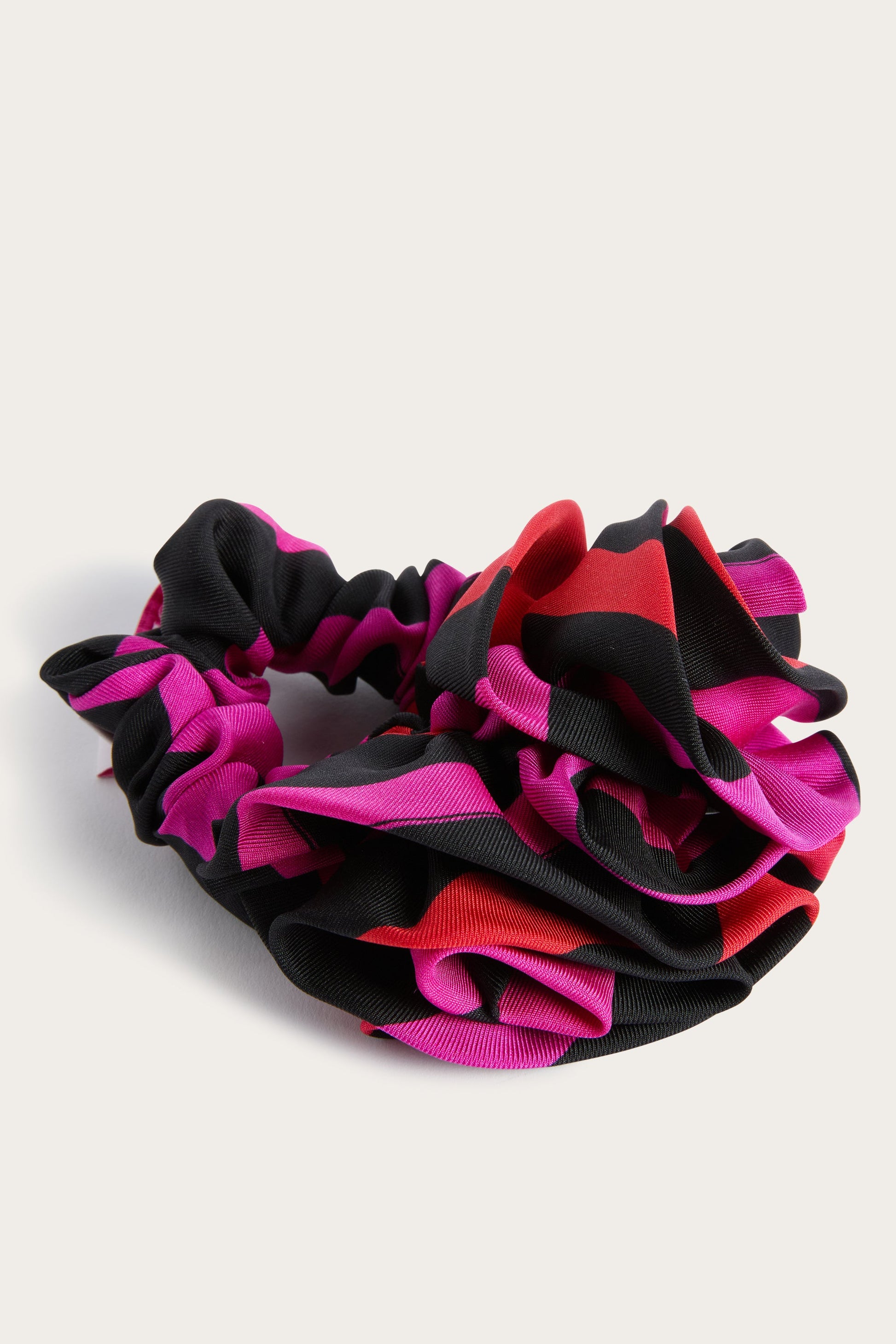 A small accessory that encapsulates the graphic aesthetic of the collection in a delicate gesture. This hair tie is made of pure silk with a Marmo print in the energetic shades of fuchsia and black, embellished with a rose-shaped detail that adds a decorative and feminine accent. Soft and lightweight, it is designed to complete your hairstyle with a refined and recognizable touch.