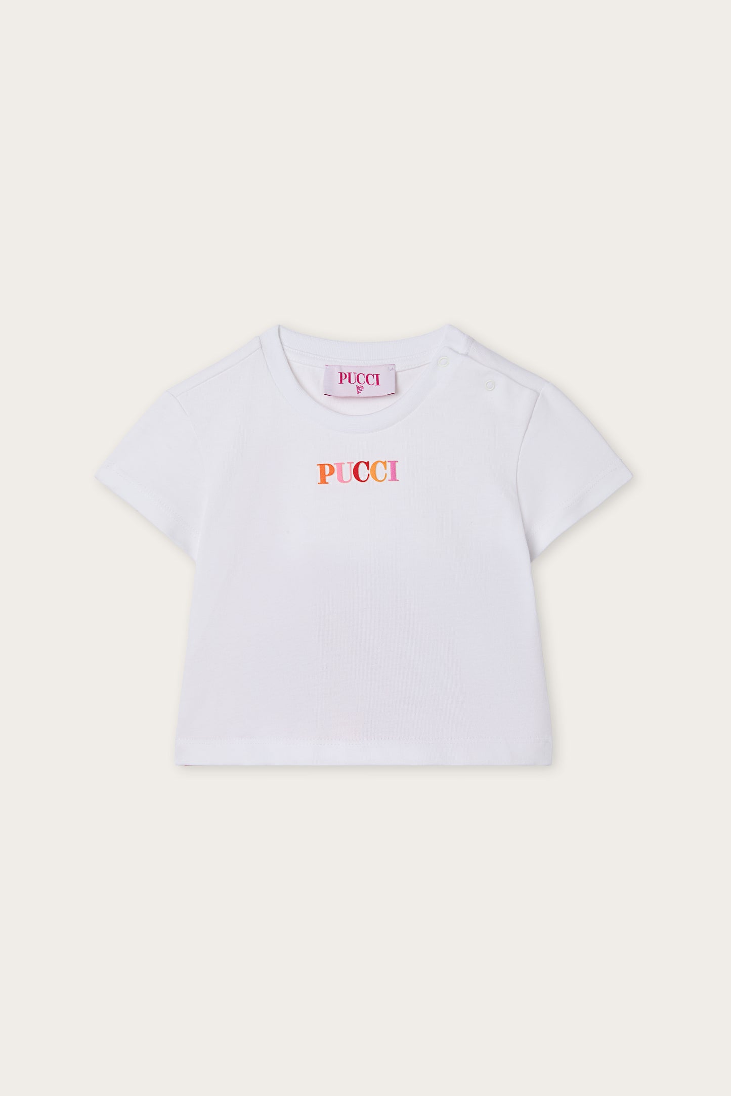 A soft-fit organic jersey T-shirt featuring snap buttons on the shoulder.The white color is enhanced by the Pucci logo embroidered in orange and a gathered hem at the back in the same shade, adding a distinctive detail.The soft, breathable cotton jersey ensures comfort and moves naturally with your body.
