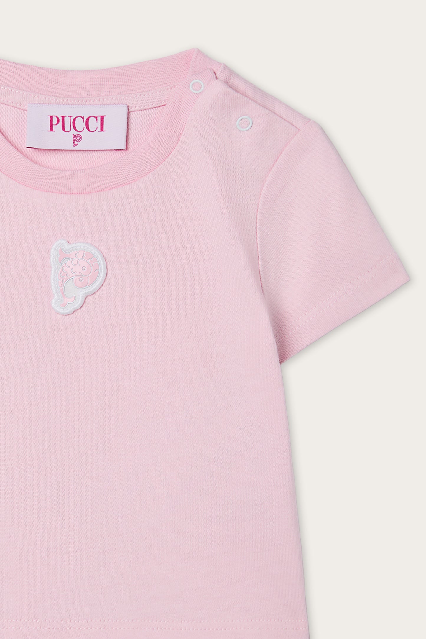 Organic jersey T-shirt with a relaxed fit, featuring snap buttons on the shoulder.The pale pink color is enhanced by an embroidered patch with the iconic Pucci fish symbol, adding a distinctive detail.The soft, breathable cotton jersey ensures comfort and moves naturally with your body.
