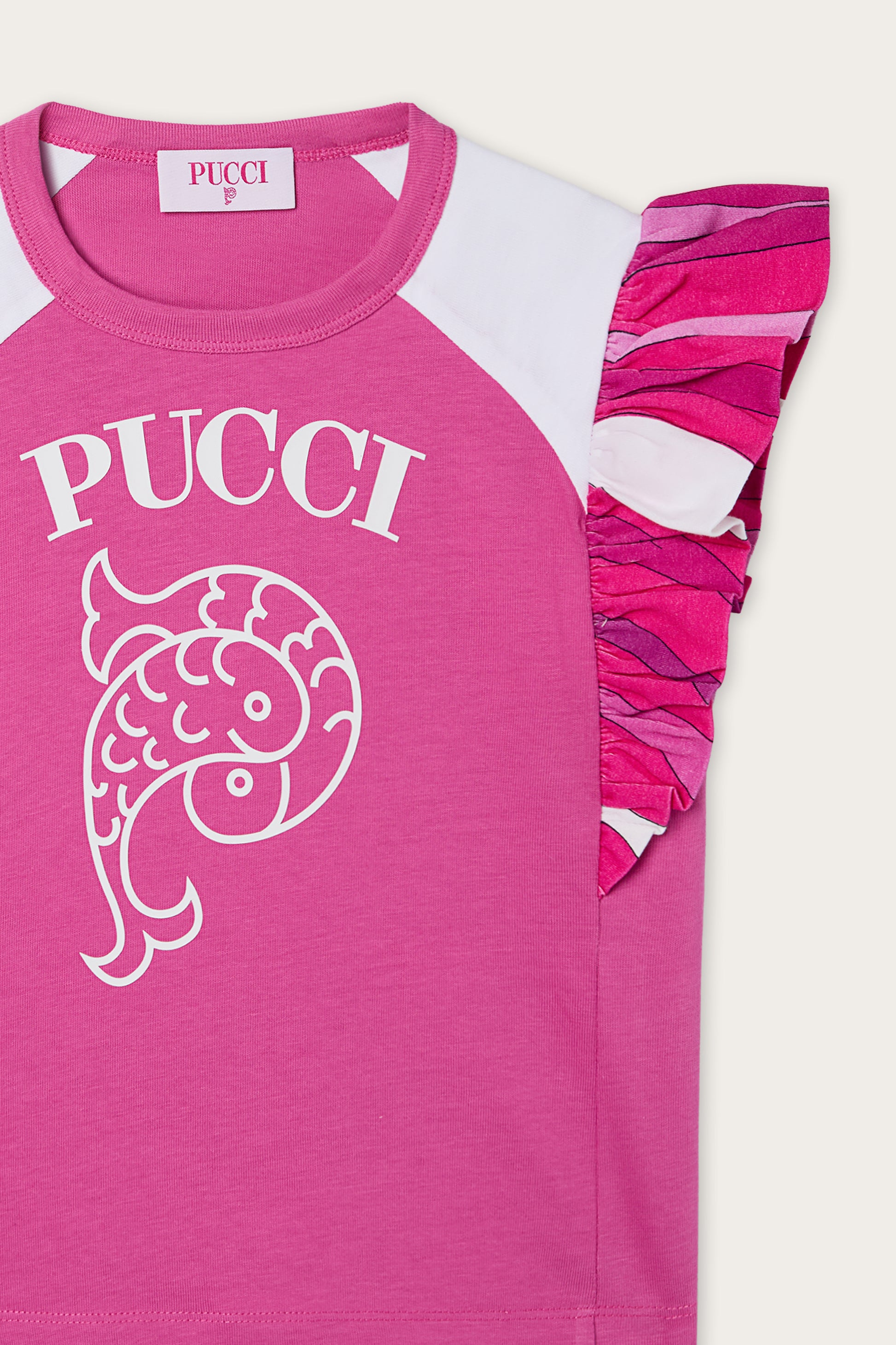 A soft-fit organic jersey T-shirt featuring ruffled sleeves.The purple color is enhanced by the Pucci logo and fish print on the front, adding a distinctive detail.The soft, breathable cotton jersey moves with you, ensuring comfort for everyday wear.