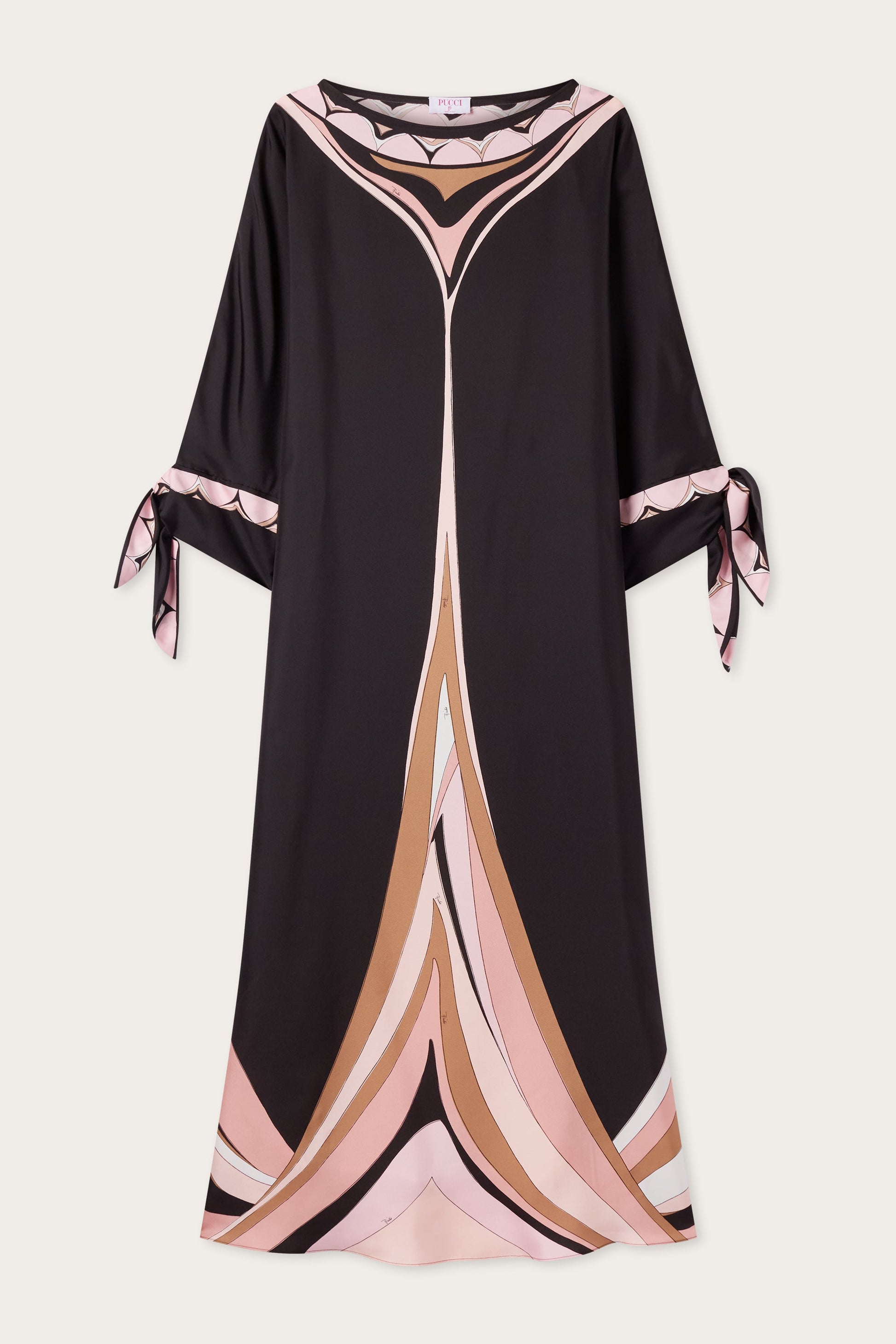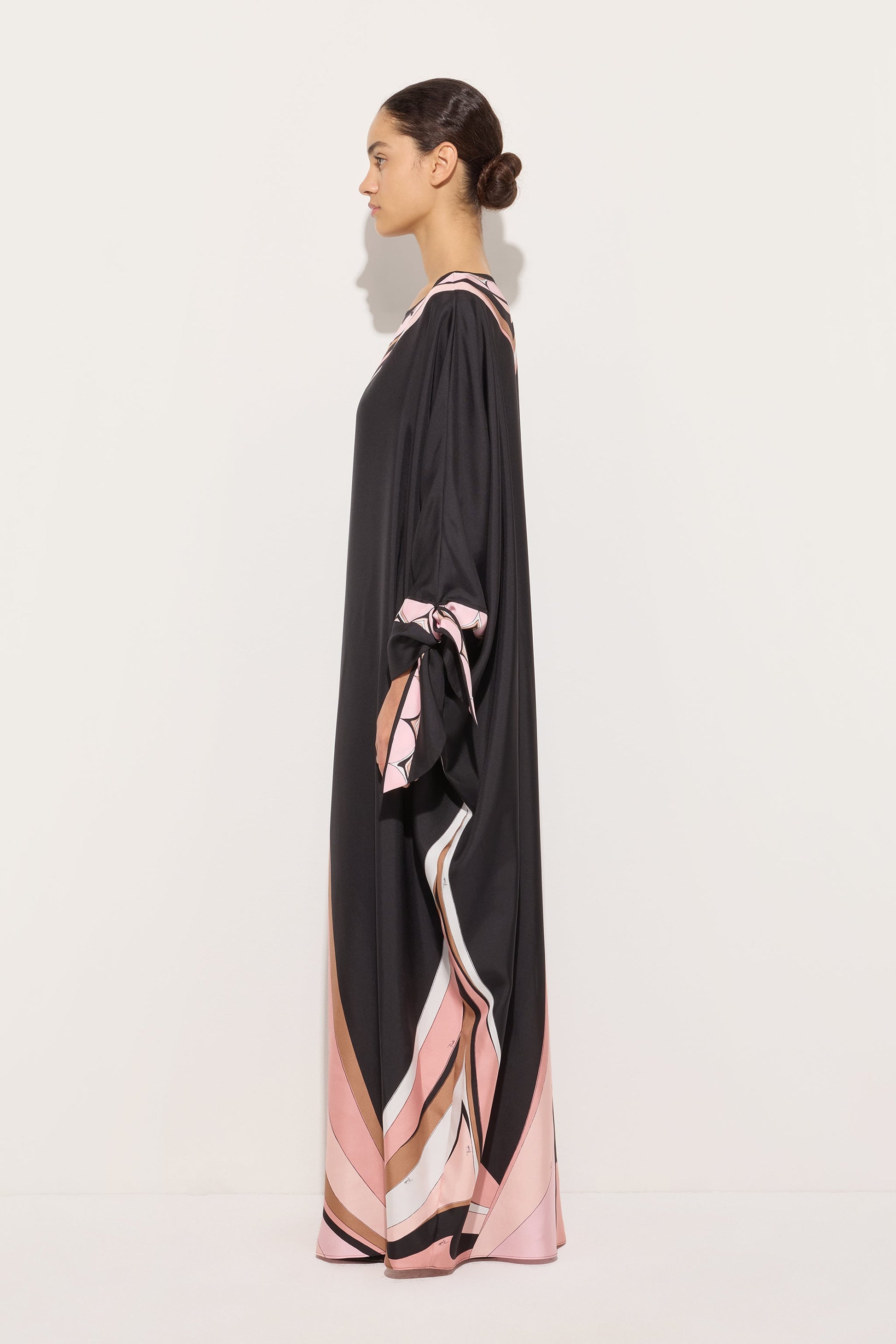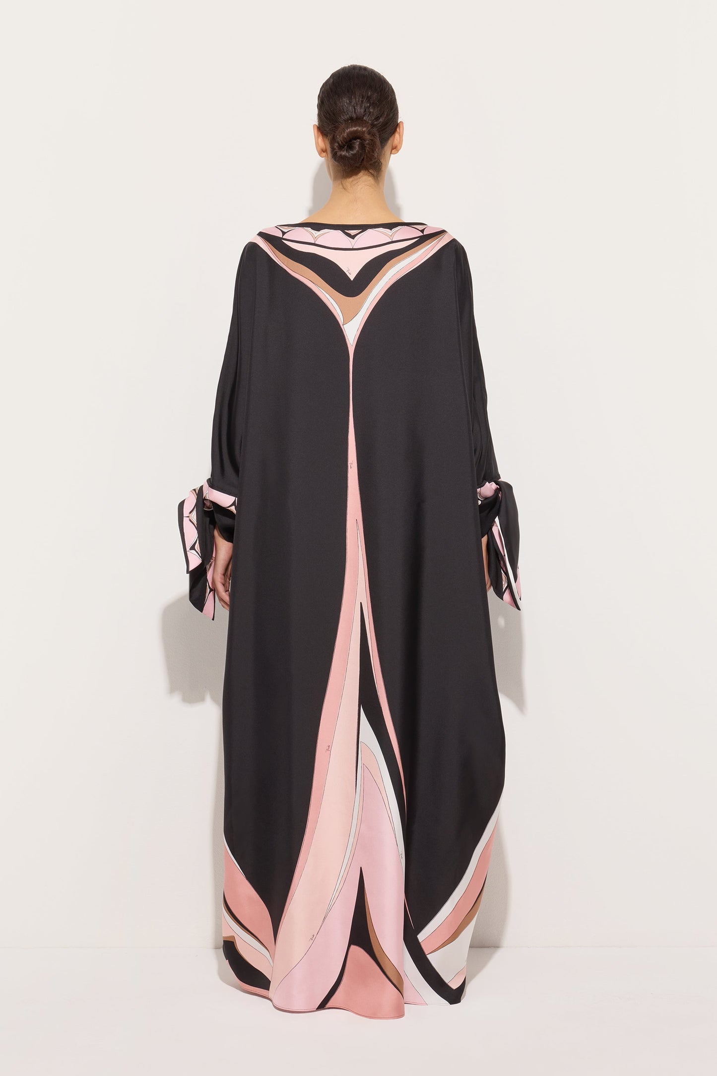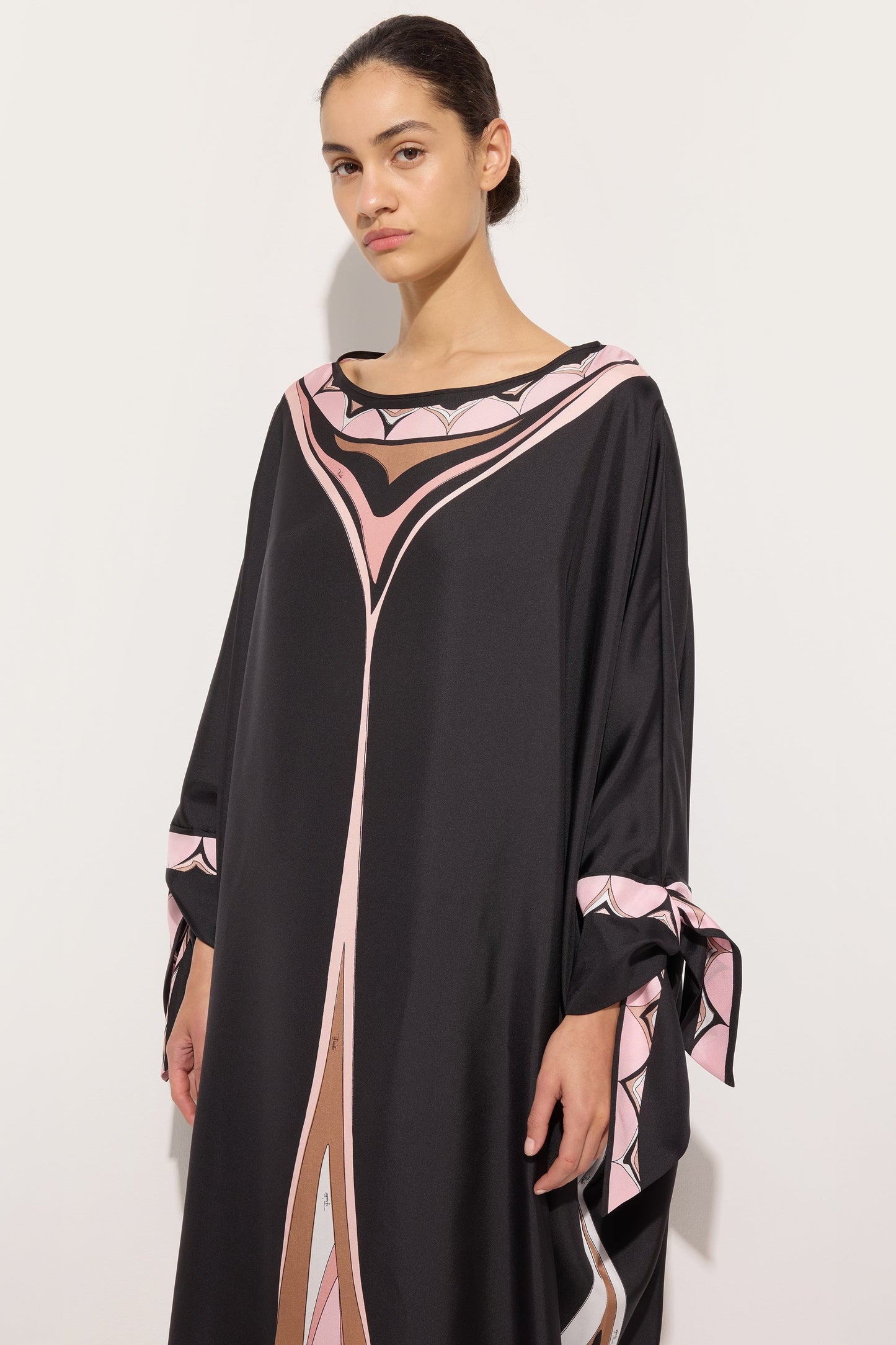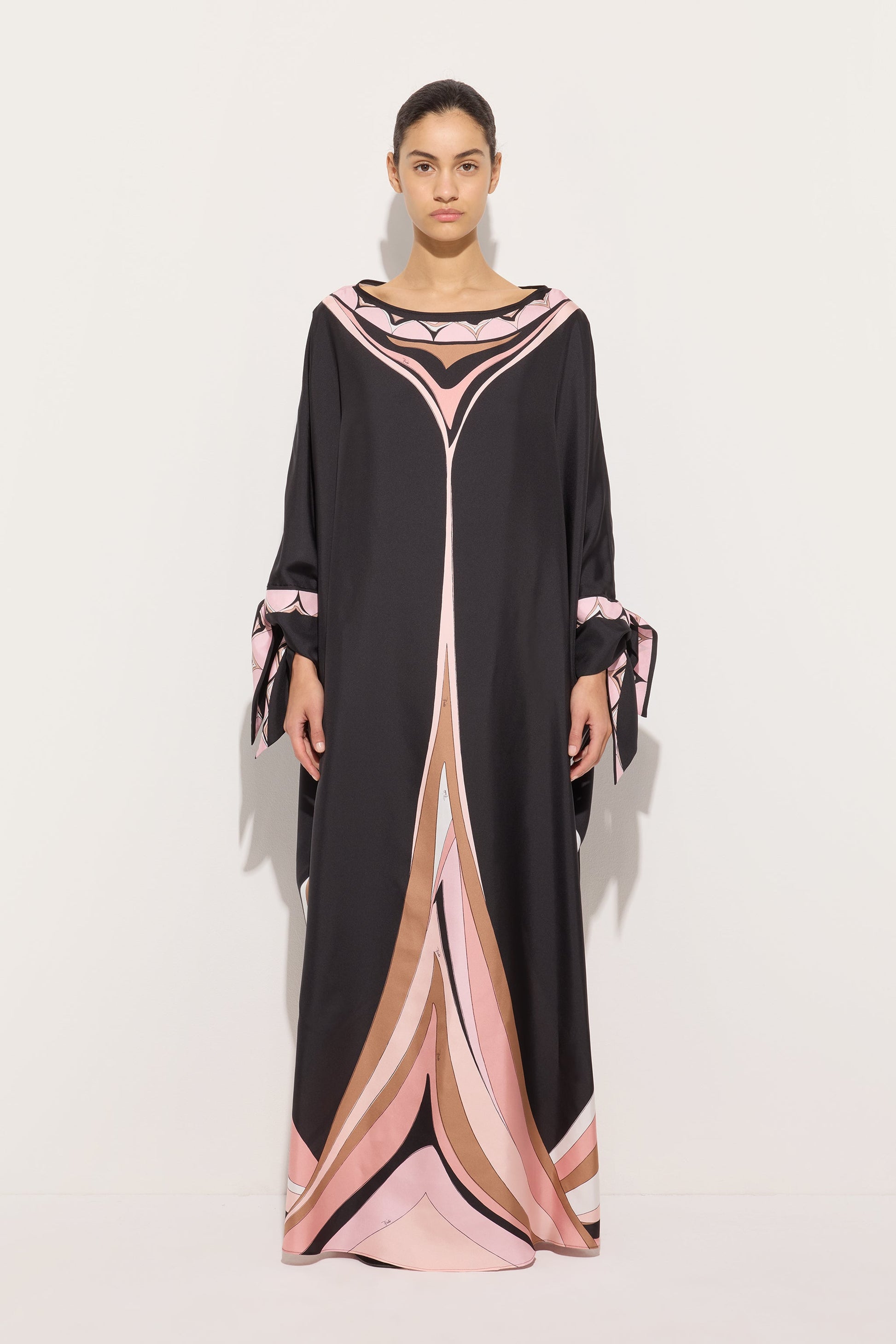 A kaftan with a fluid and refined presence that interprets movement with lightness. Made of silk twill, it glides naturally over the body, while the sleeves that tie at the wrists introduce a delicate and adjustable detail that defines the gesture. The Fari print, in nude tones, enlivens the surface with a soft and luminous rhythm, evoking an essential and timeless elegance.
