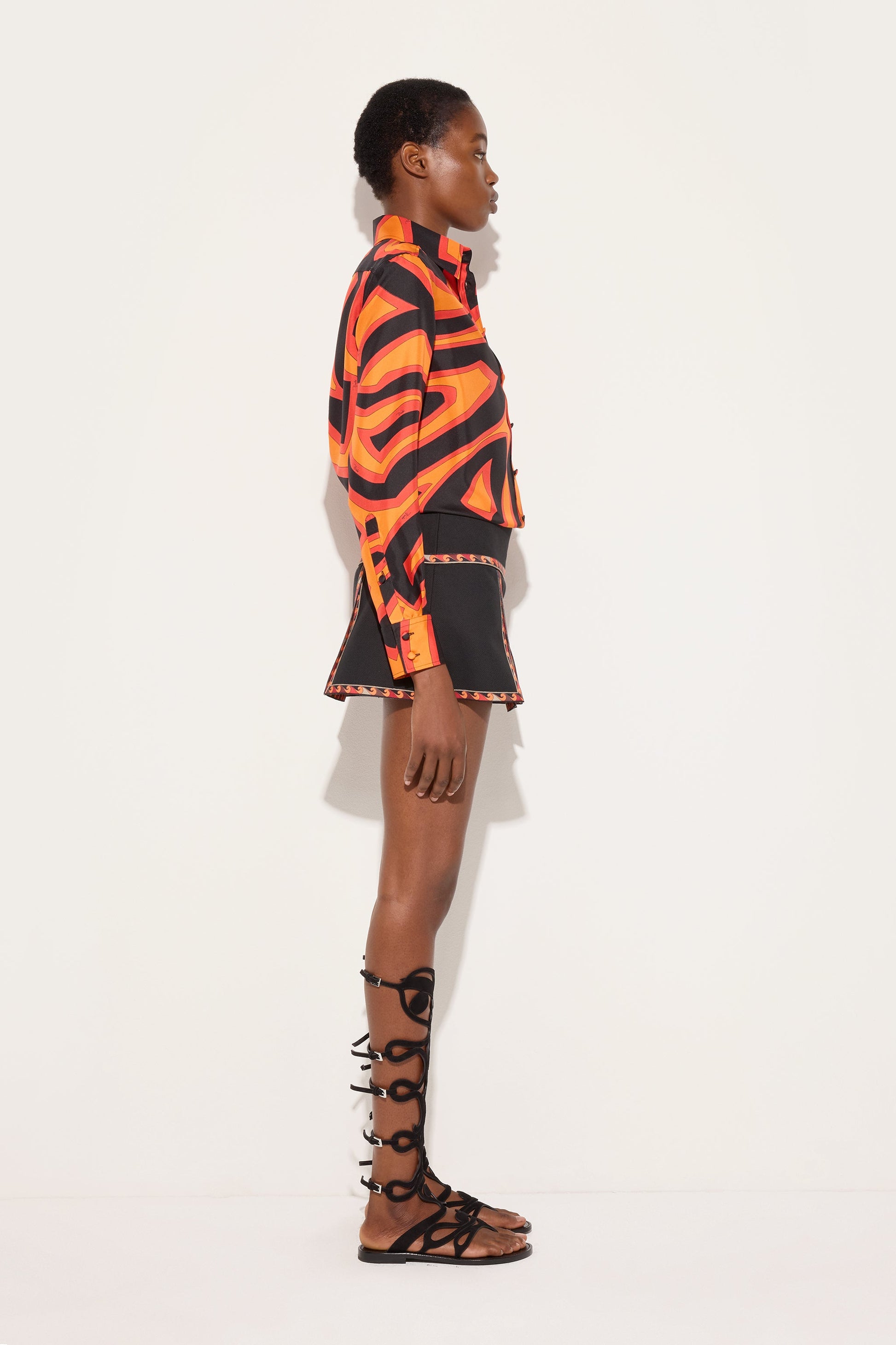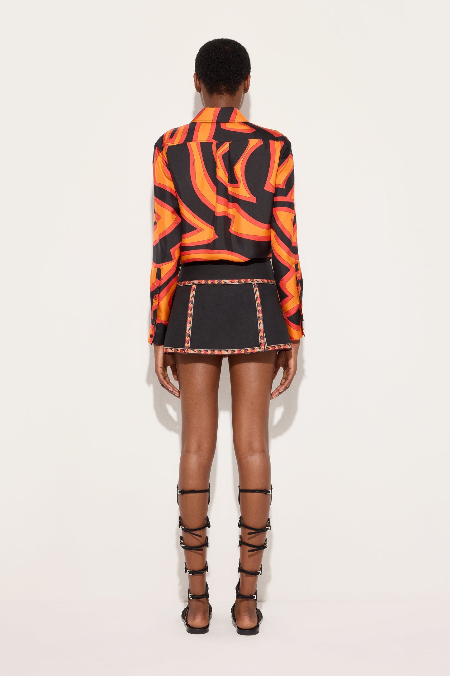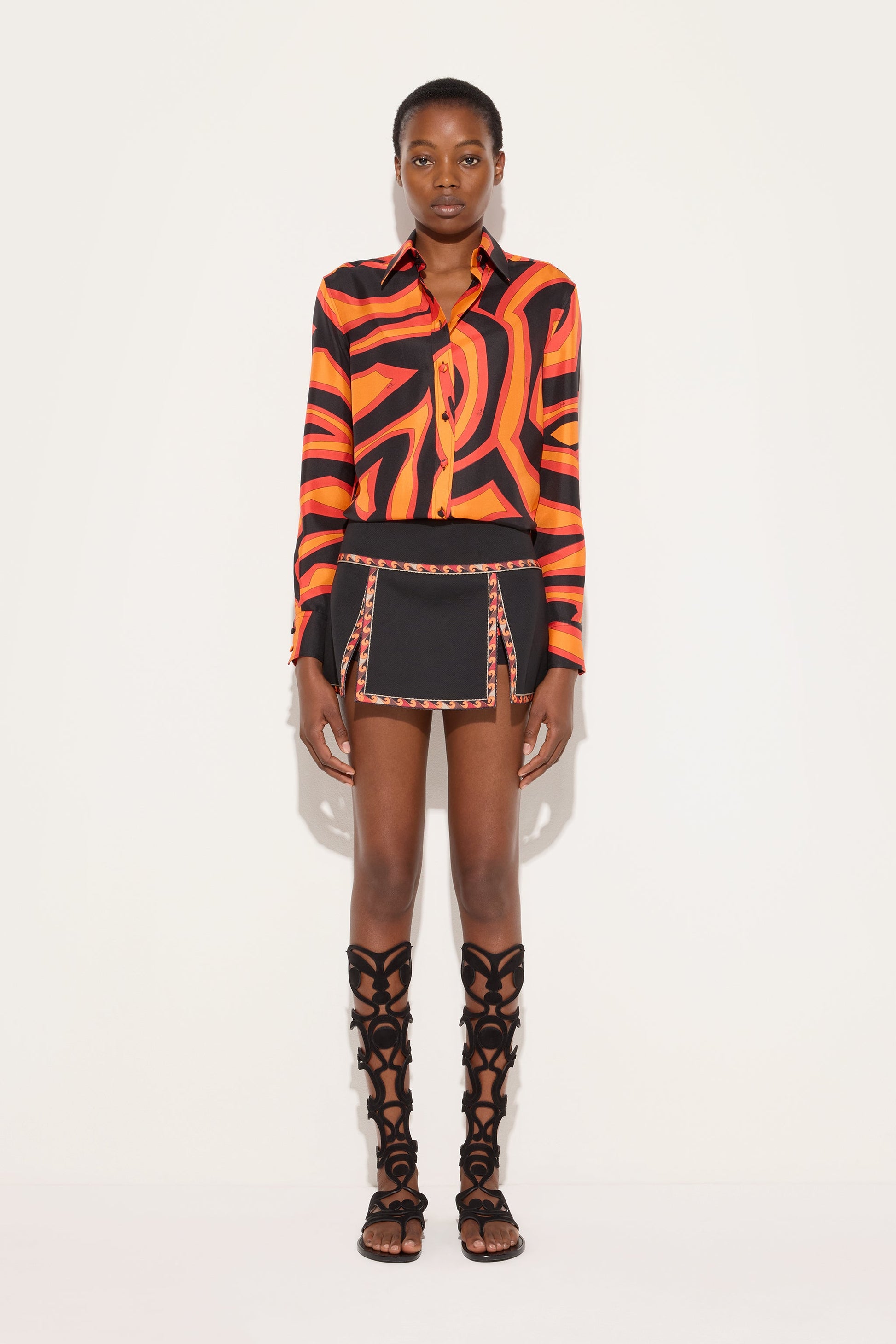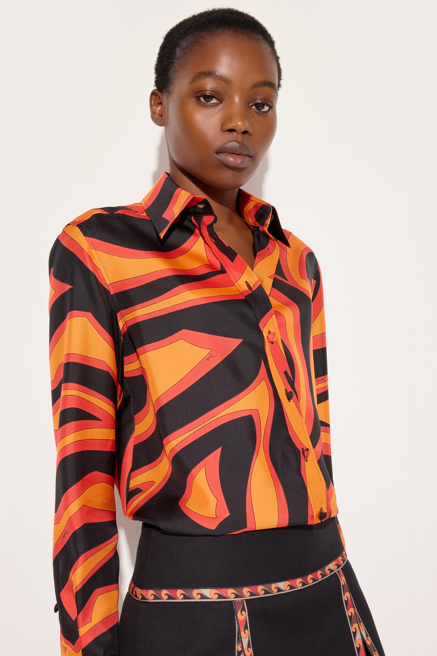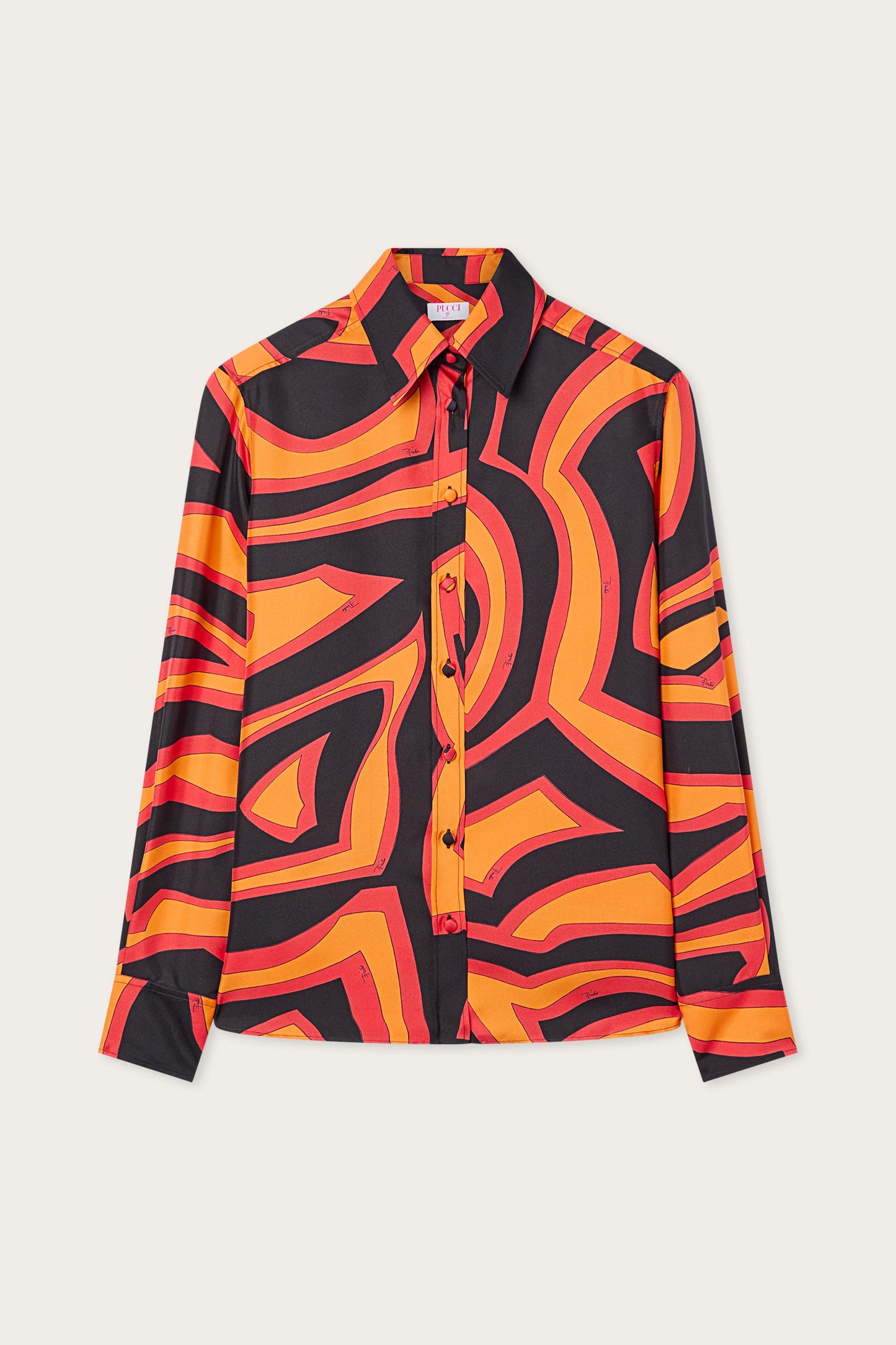 A shirt with essential elegance that highlights the graphic power of the Labirinto print. Made from silk twill, it features a classic collar and a front button closure that defines a clean and timeless line. The regular fit and length naturally accompany the body, while the orange and black shades illuminate the surface with a lively and contemporary effect. A refined garment, designed to enhance the color and fluidity of the fabric with balance.