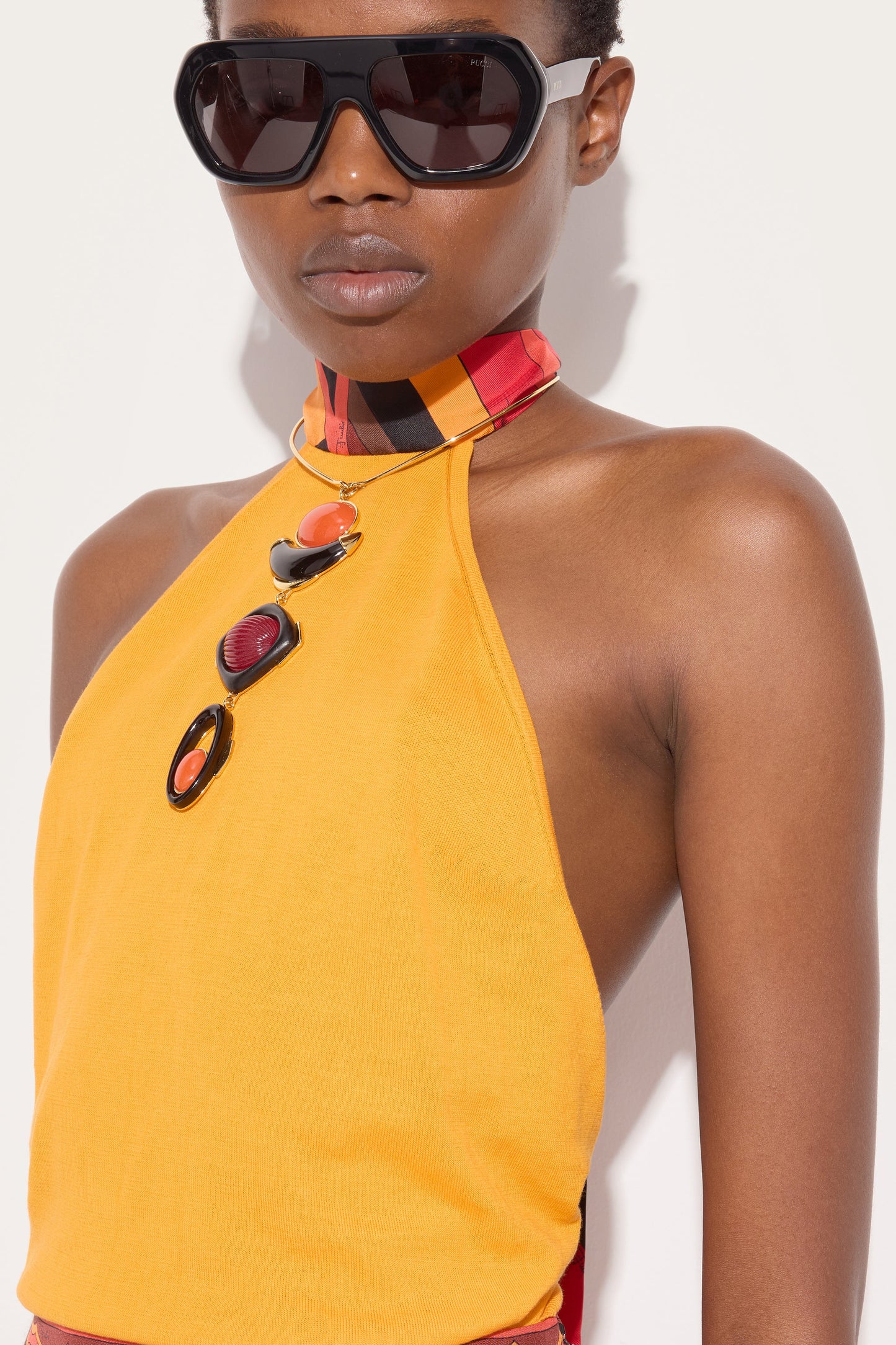 This top features a fluid, contemporary design that plays with sartorial details and contrasting materials. The essential back lacing creates a clean, structured look, while the printed silk twill adds a light touch. The vibrant orange shade elevates the design, harmonising fresh modernity with timeless refinement.