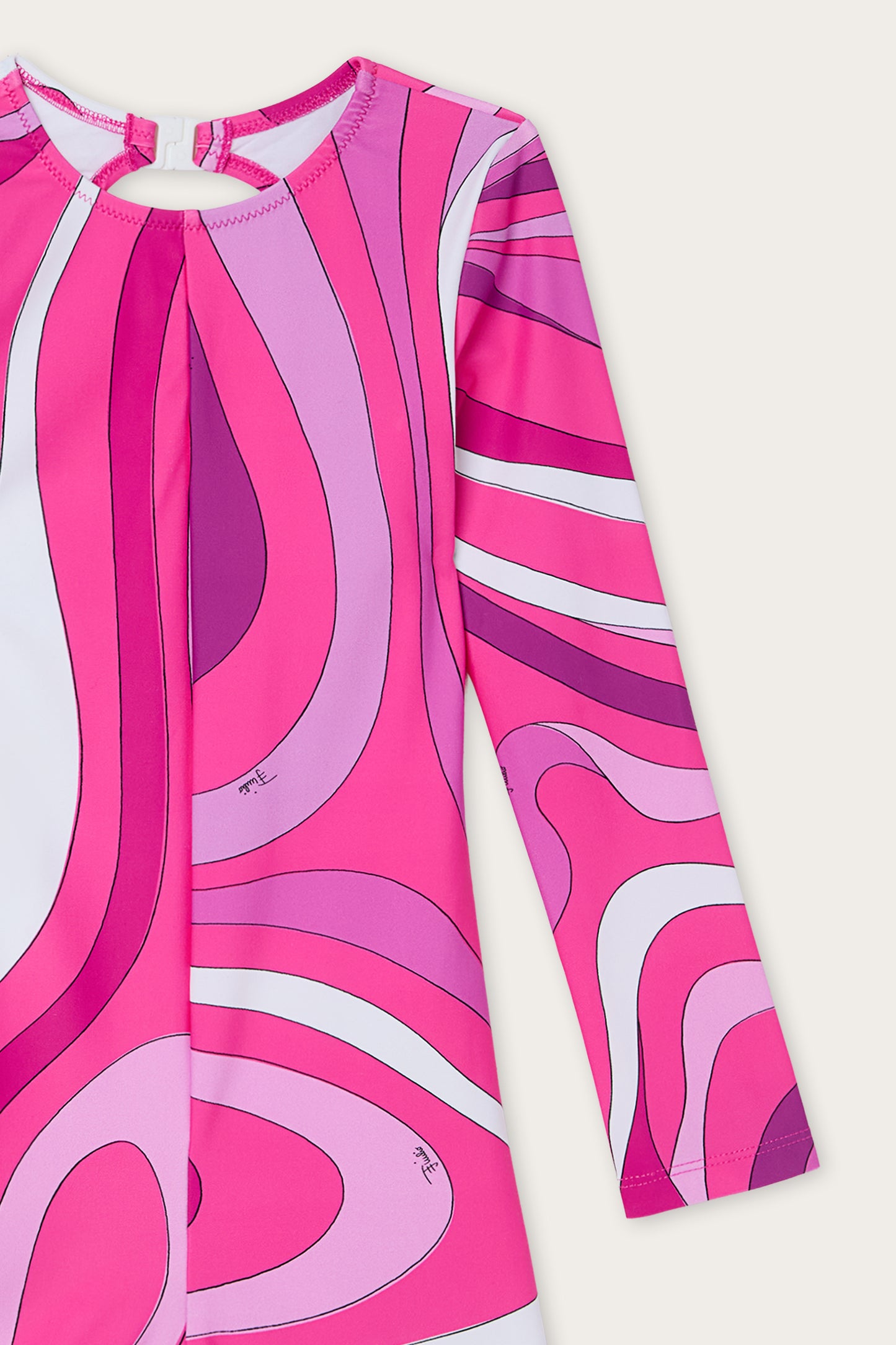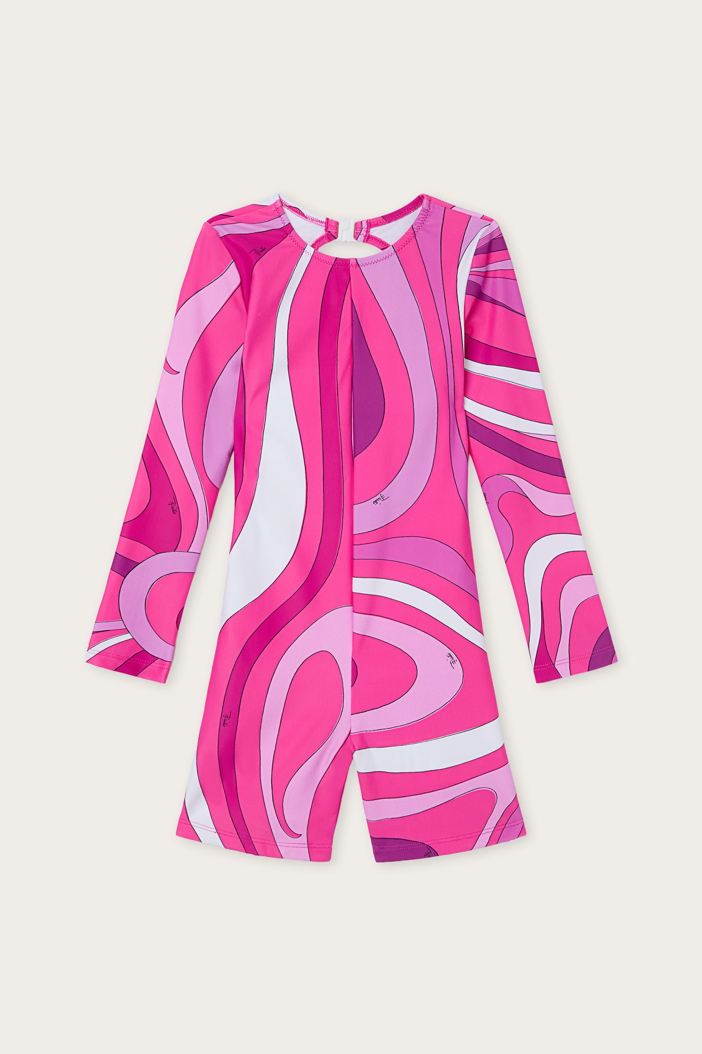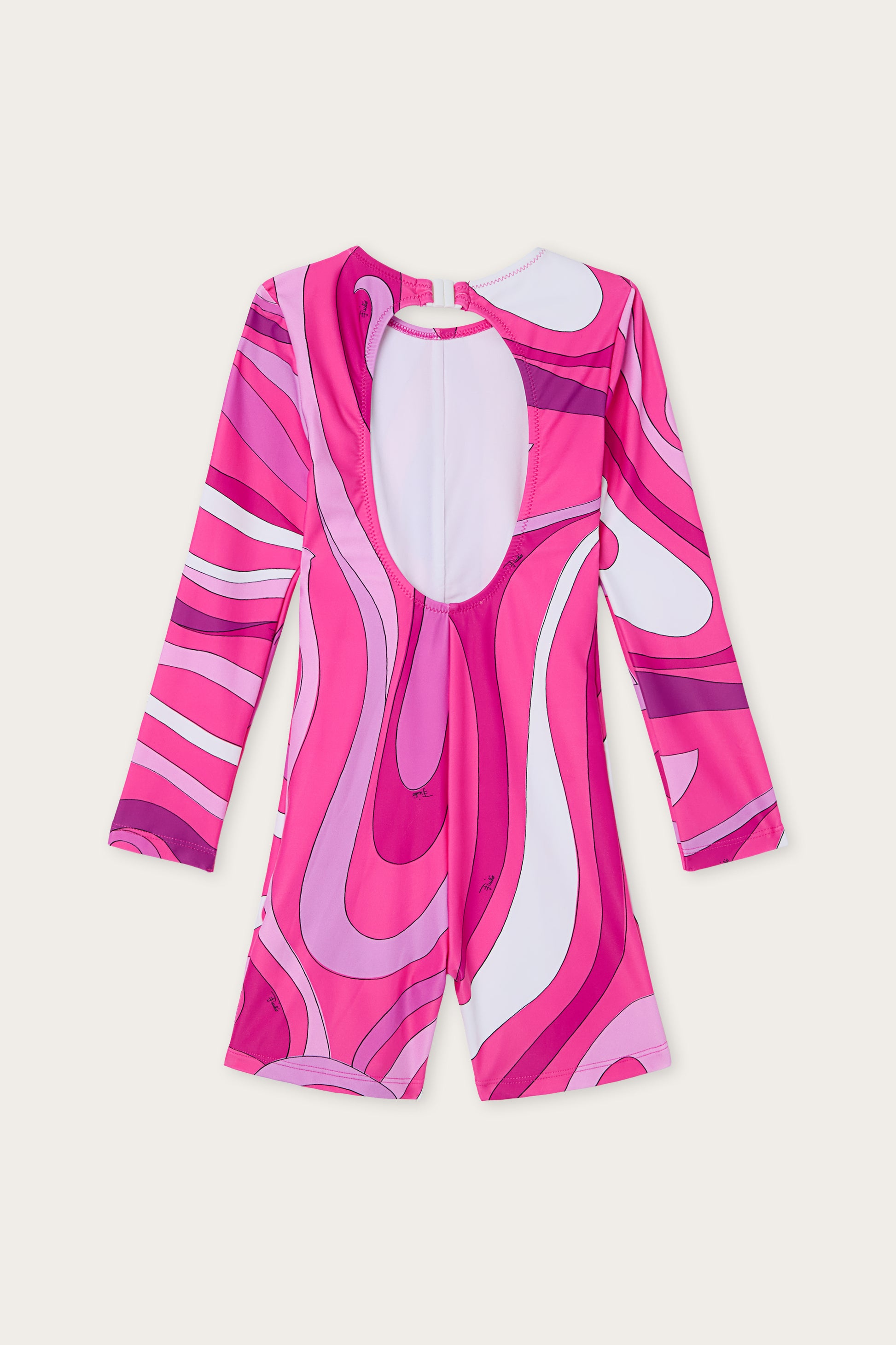 A Lycra swimsuit with long sleeves and shorts, featuring a form-fitting and functional design.The Marmo print in shades of purple and white defines the design with a dynamic graphic accent.The porthole opening on the back adds a distinctive detail, while the stretch fabric ensures freedom of movement and comfort in the water.