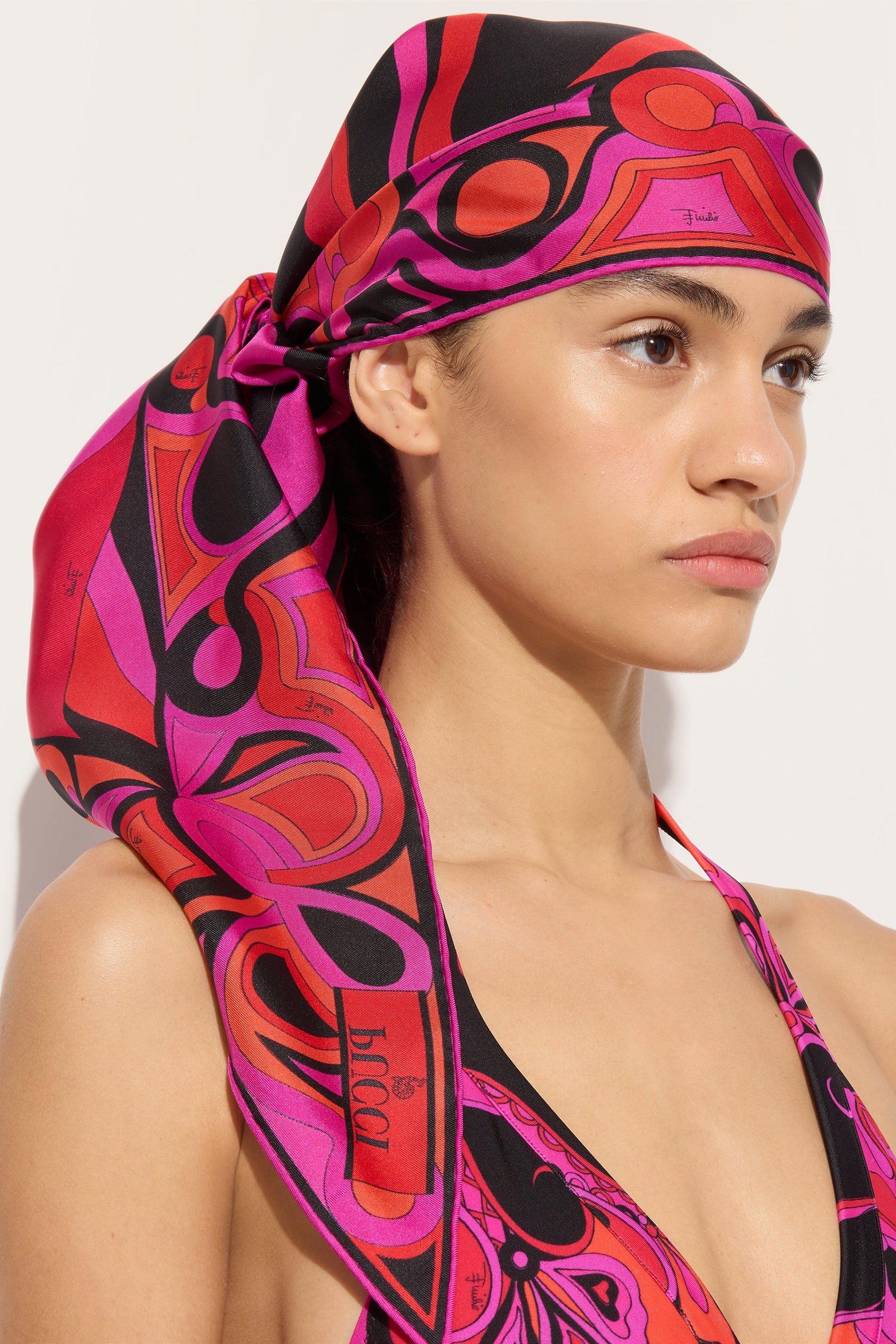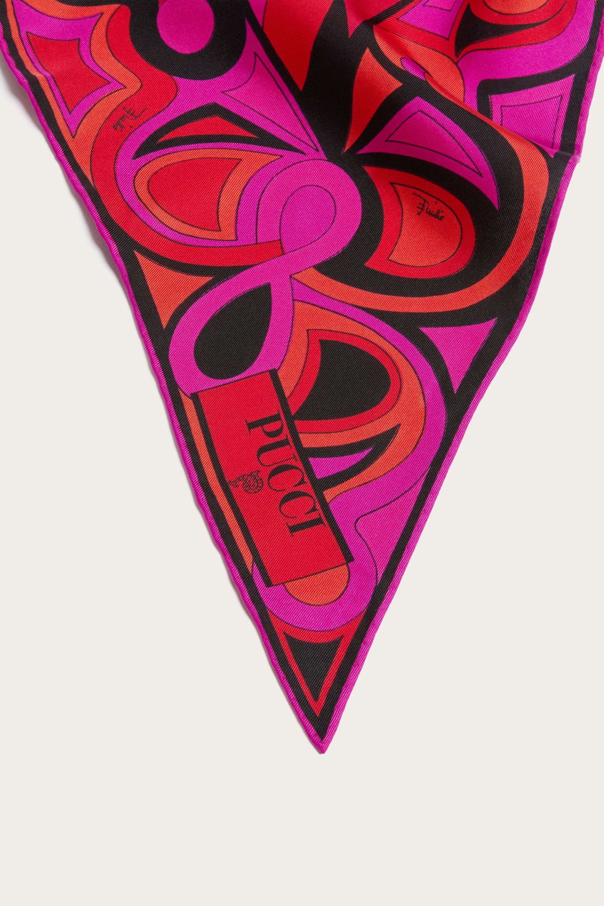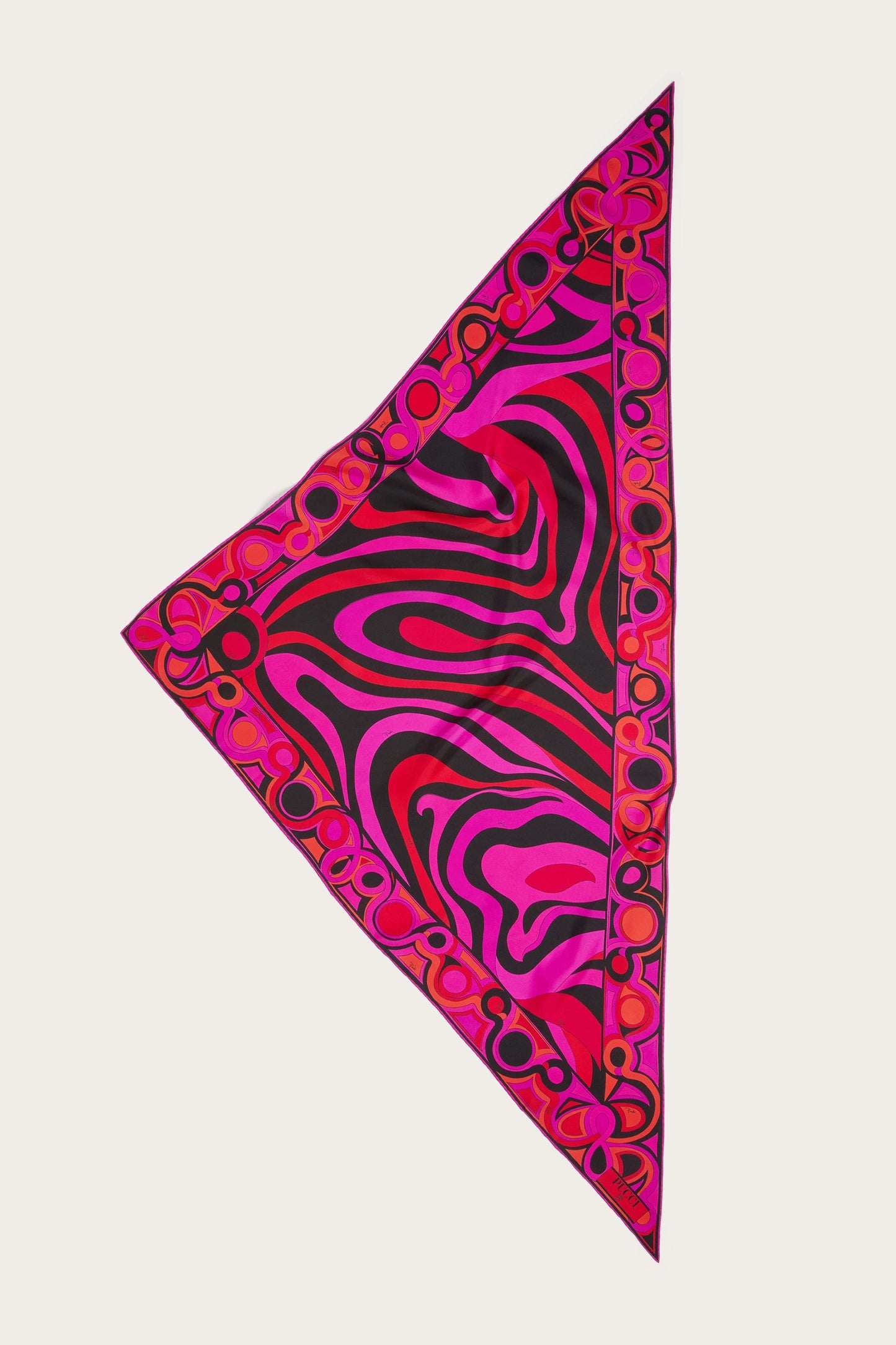 A timeless accessory that celebrates Pucci's distinctive elegance and creativity. This printed silk twill triangle, in this iconic mix of patterns, is a true masterpiece of style.Its versatility makes it perfect for wearing in different ways: around the neck, as a headband, or tied to a bag for a refined touch. The softness and lightness of the silk make it pleasant to wear, adding a touch of luxury to any outfit.