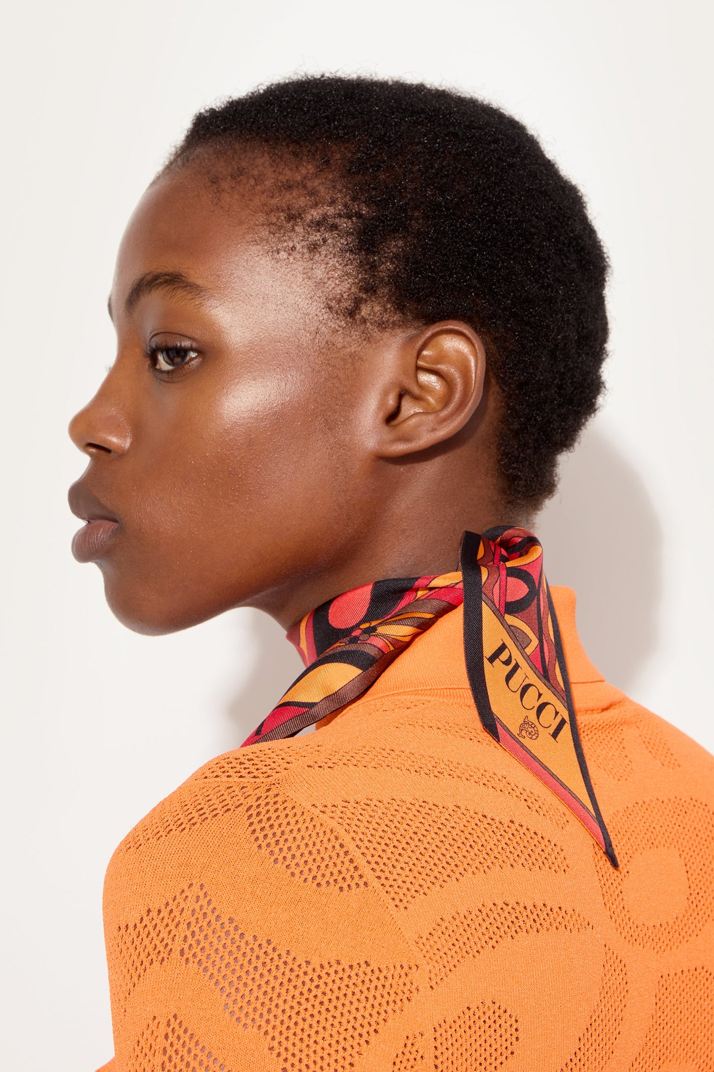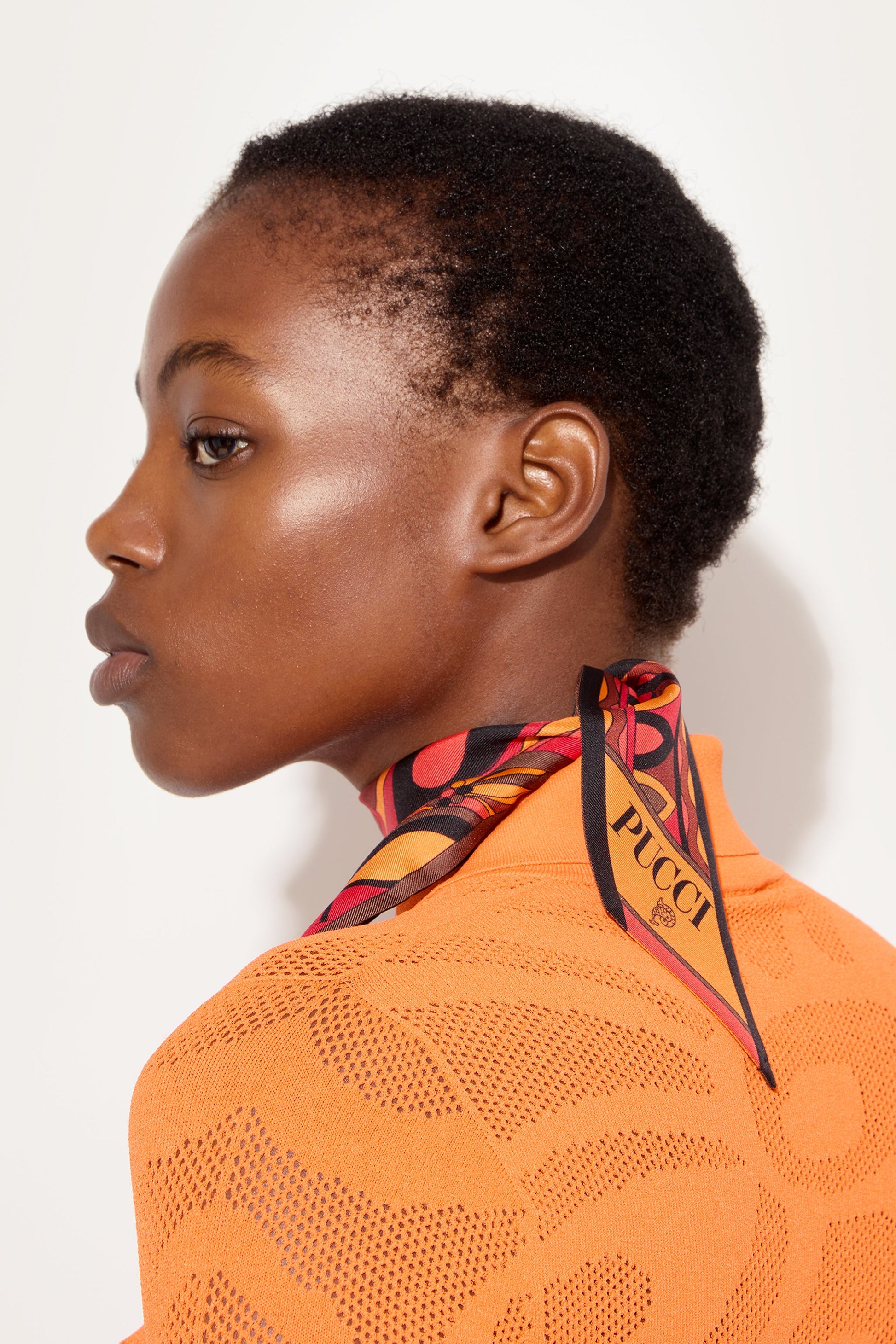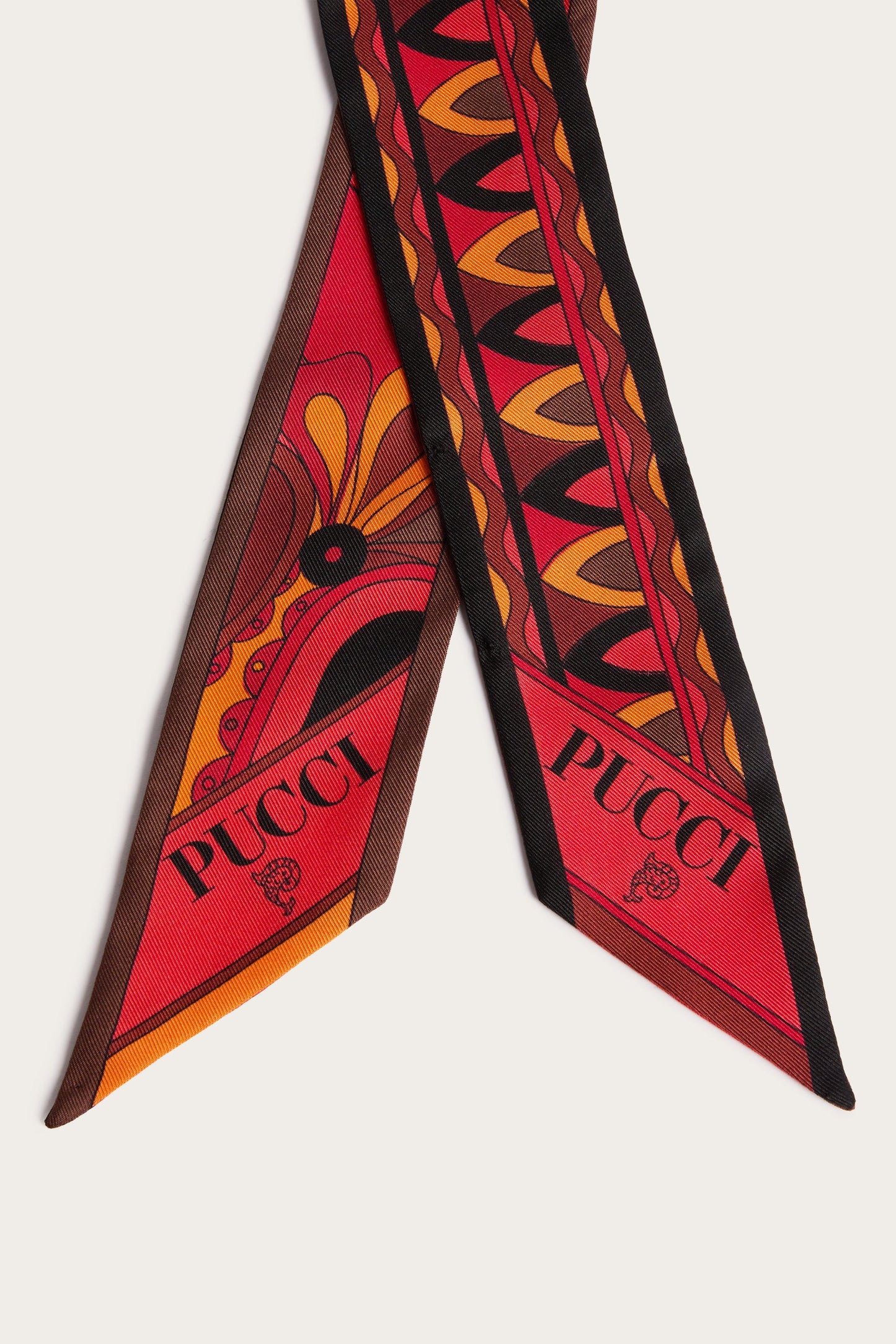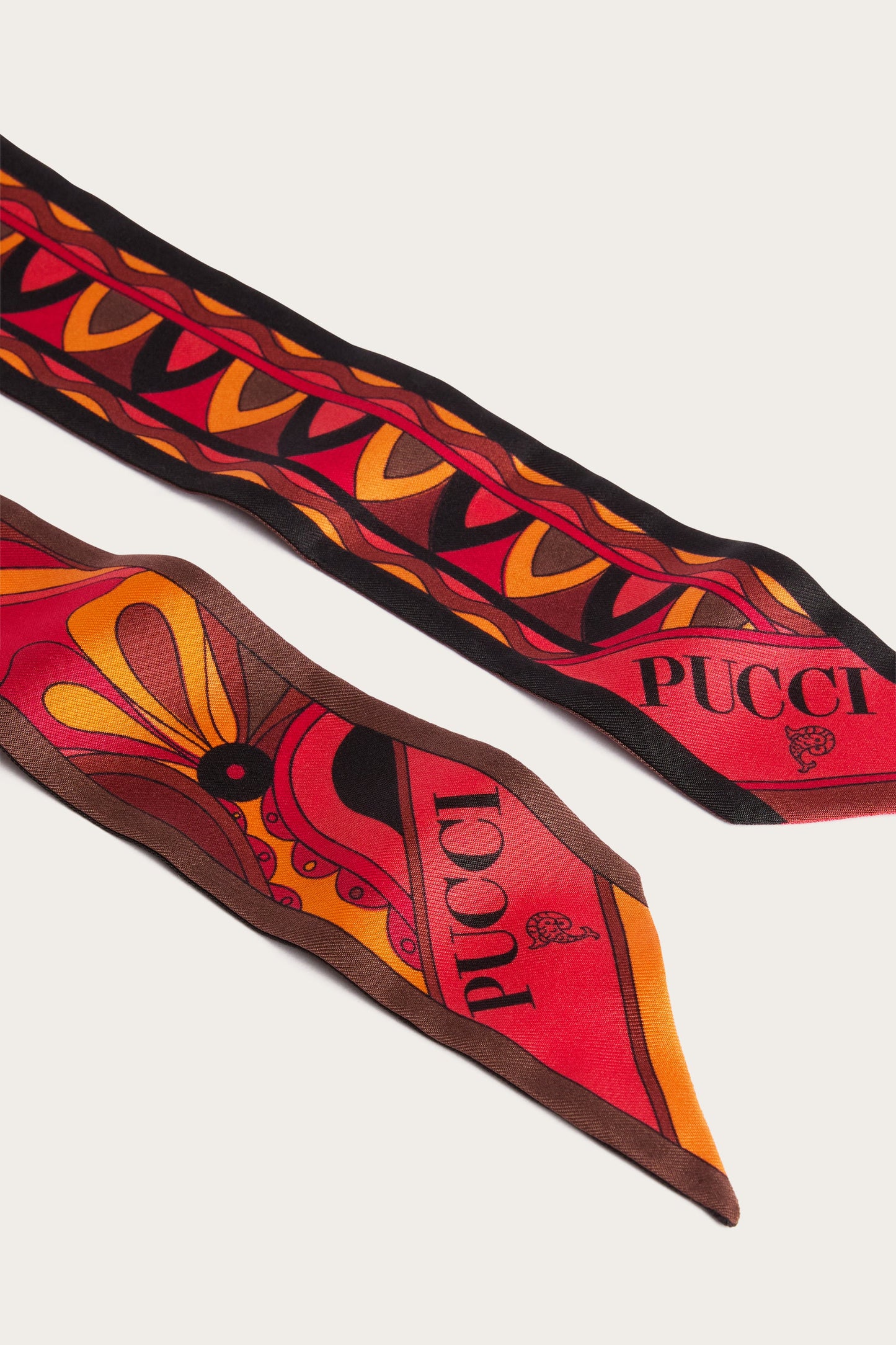 An elegant and versatile accessory, perfect for adding a touch of color to any look. This silk twill scarf features pointed edges and a refined interplay of prints in shades of orange and black. Lightweight and sophisticated, it can be worn in a variety of ways: as a headband, around the wrist, or tied to a bag for a distinctive detail that expresses the unmistakable Pucci style.