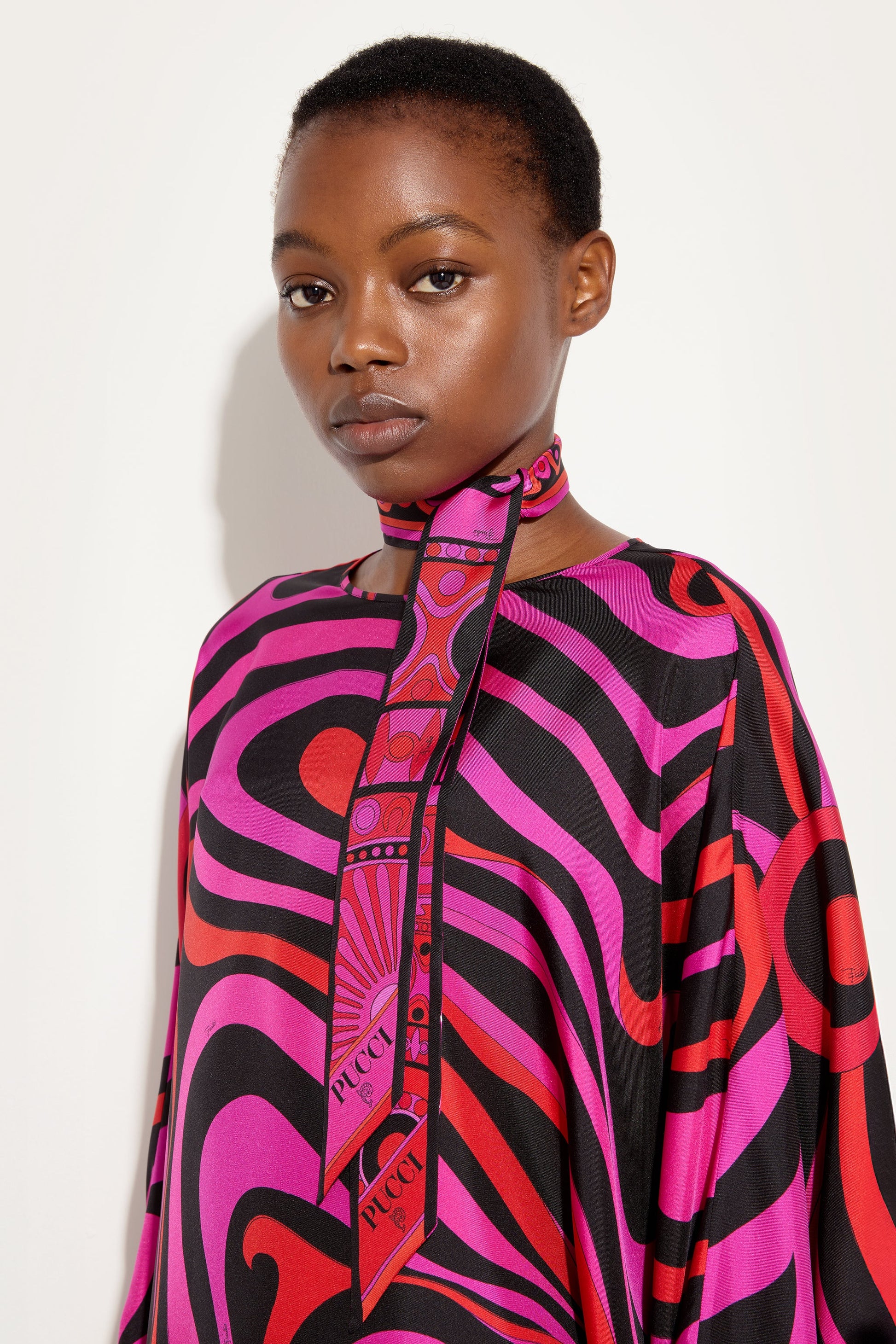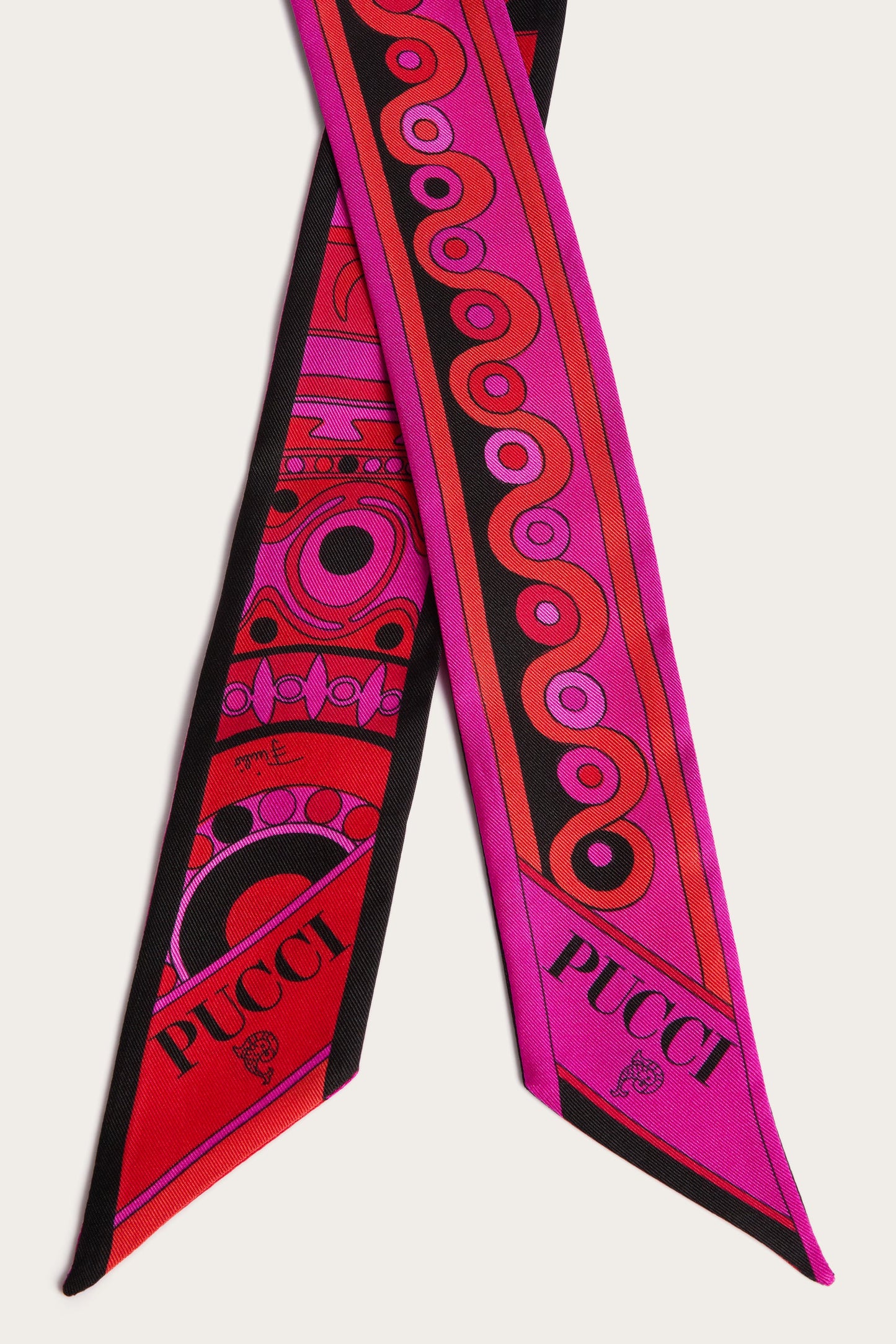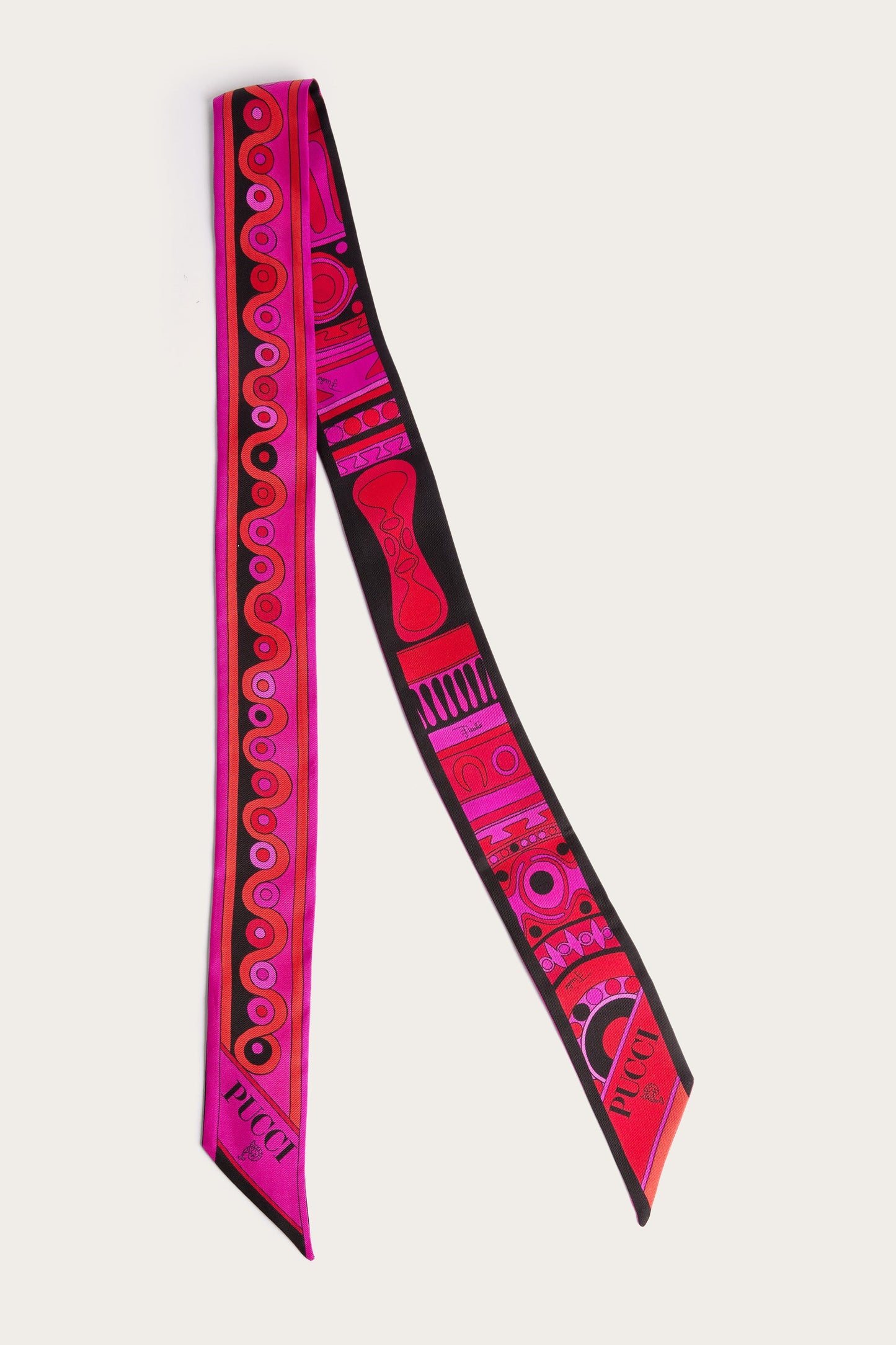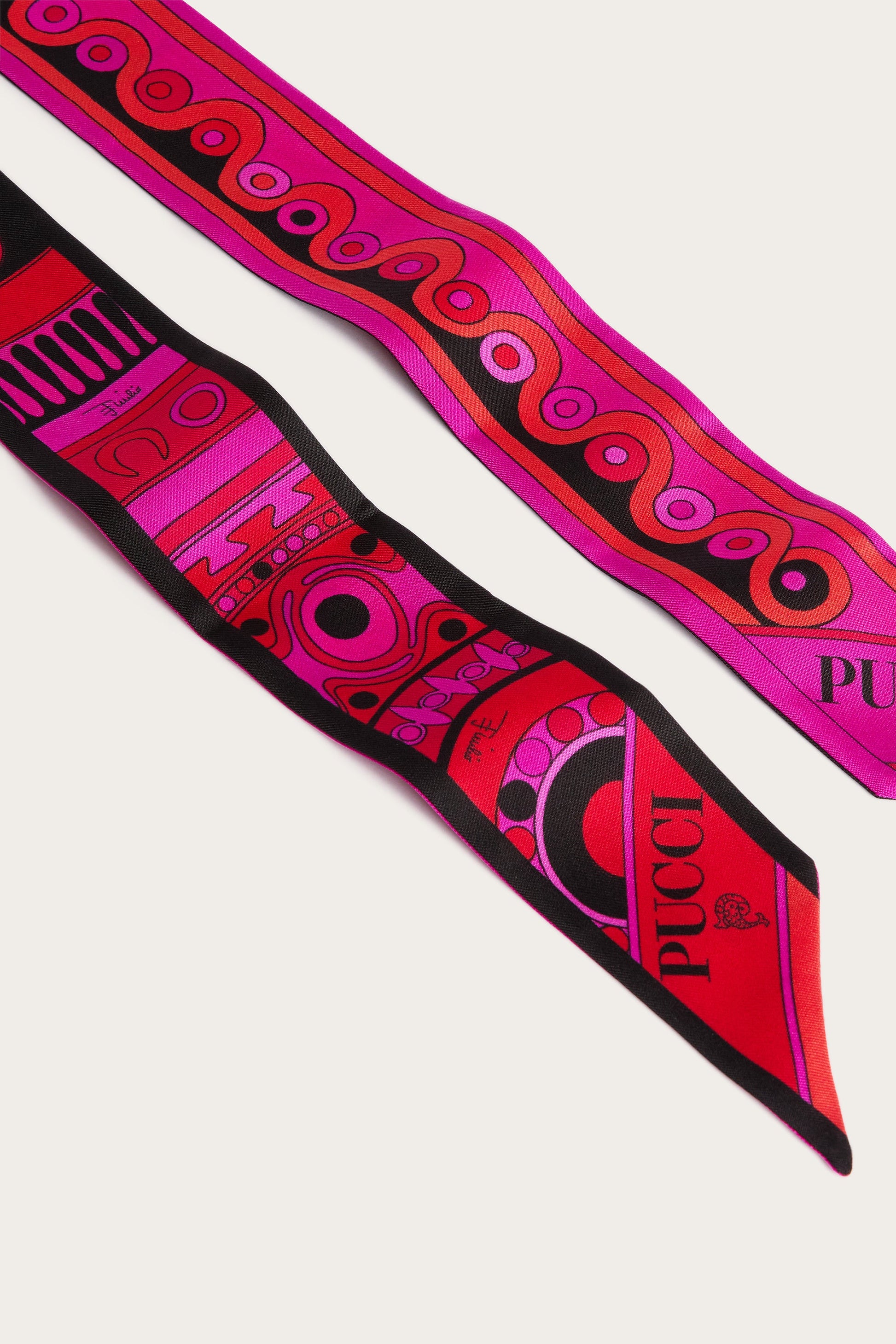 An elegant and versatile accessory, perfect for adding a touch of color to any look. This silk twilleau features pointed edges and a refined mix of prints. Lightweight and sophisticated, it can be worn in a variety of ways: as a headband, around the wrist, or tied to a bag for a distinctive detail that expresses the unmistakable Pucci style.