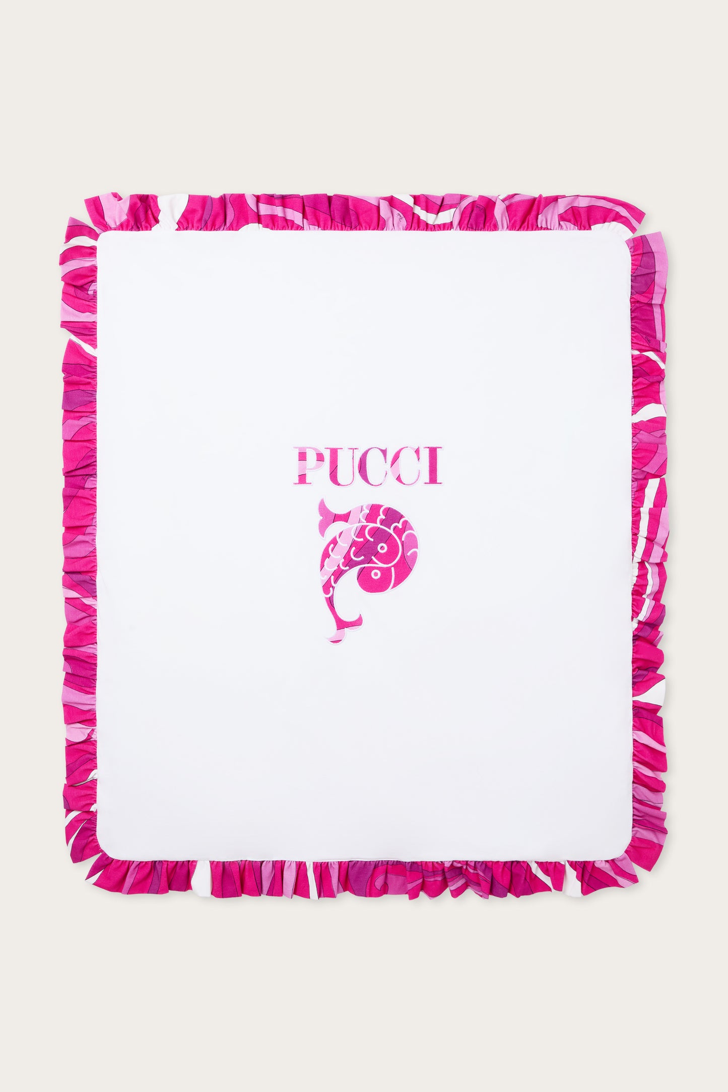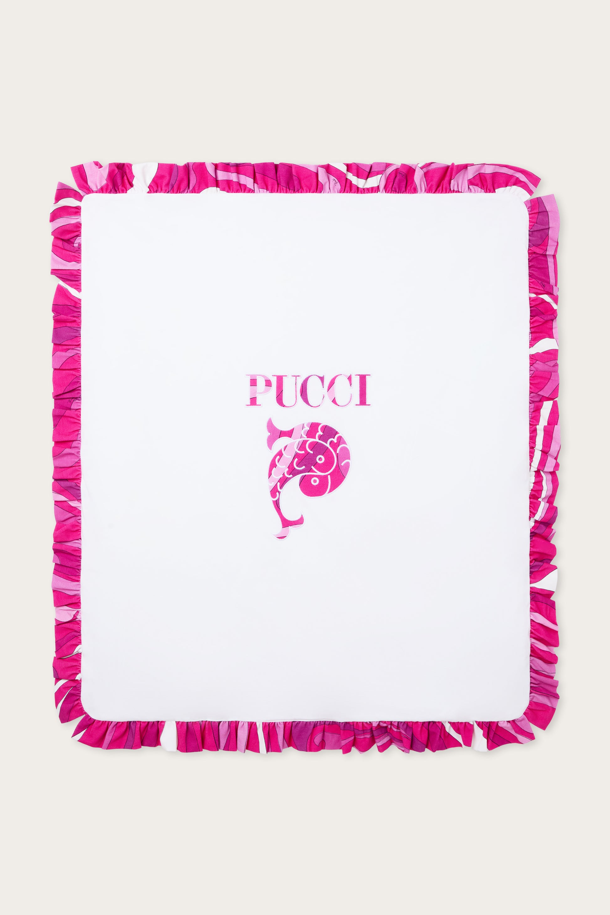 A blanket made of organic jersey with ruffled edges, designed to wrap your baby in softness.The central print featuring the Pucci logo add a distinctive detail to the item.The cotton jersey ensures a soft and comfortable feel against your little one’s skin.