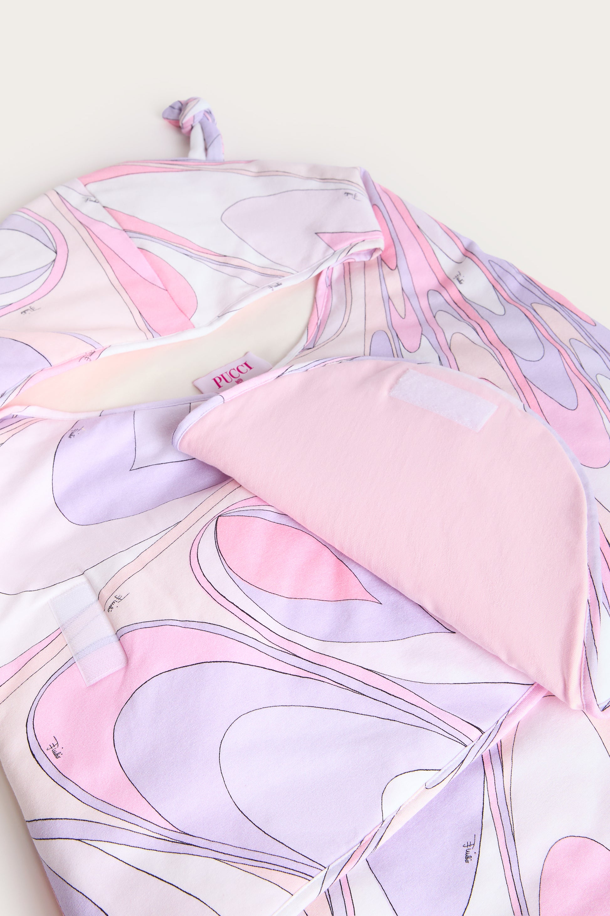 Cozy as a hug, this organic jersey baby nest is designed to wrap with softness and color. The stretch fabric provides a comfortable feel on baby's delicate skin, while the Onde print in shades of pink and lilac lends a delicate and iconic touch.Ideal for cuddles, walks or naps, it is an accessory that combines functionality and style with the unmistakable Pucci spirit.