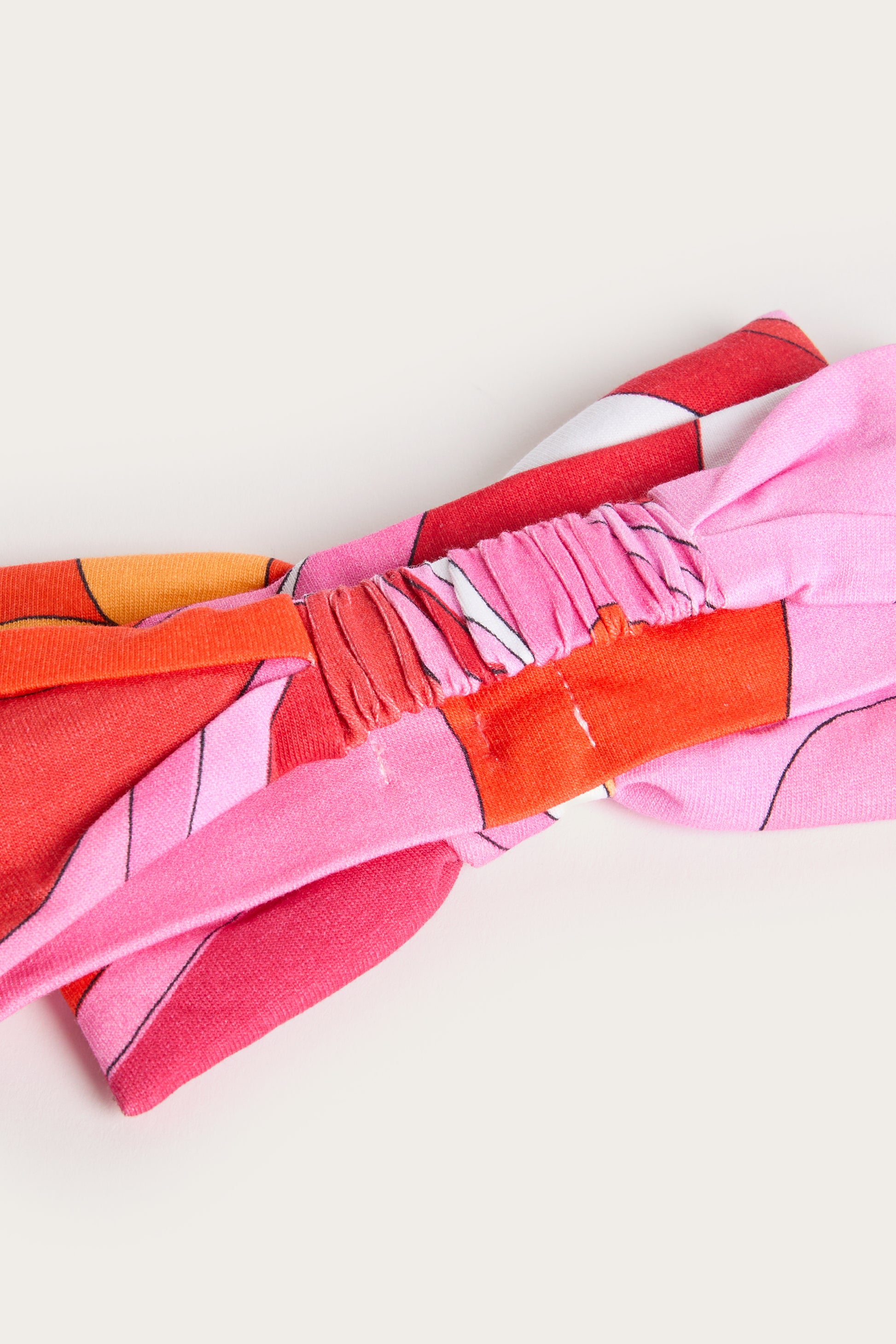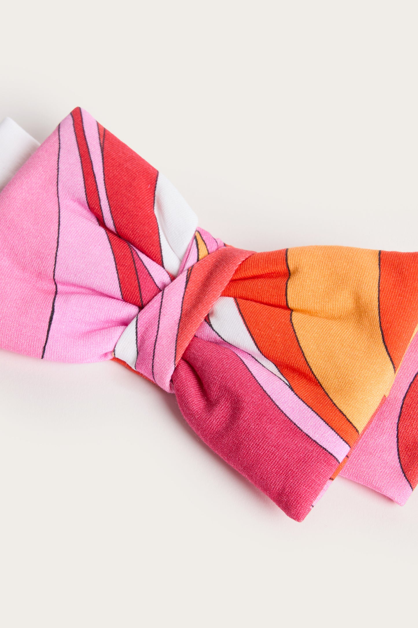 An elastic headband made of organic jersey with a bow, designed for a comfortable fit.The Onde print in shades of strawberry pink and orange adds a lively graphic accent.The stretch cotton jersey ensures softness and flexibility.