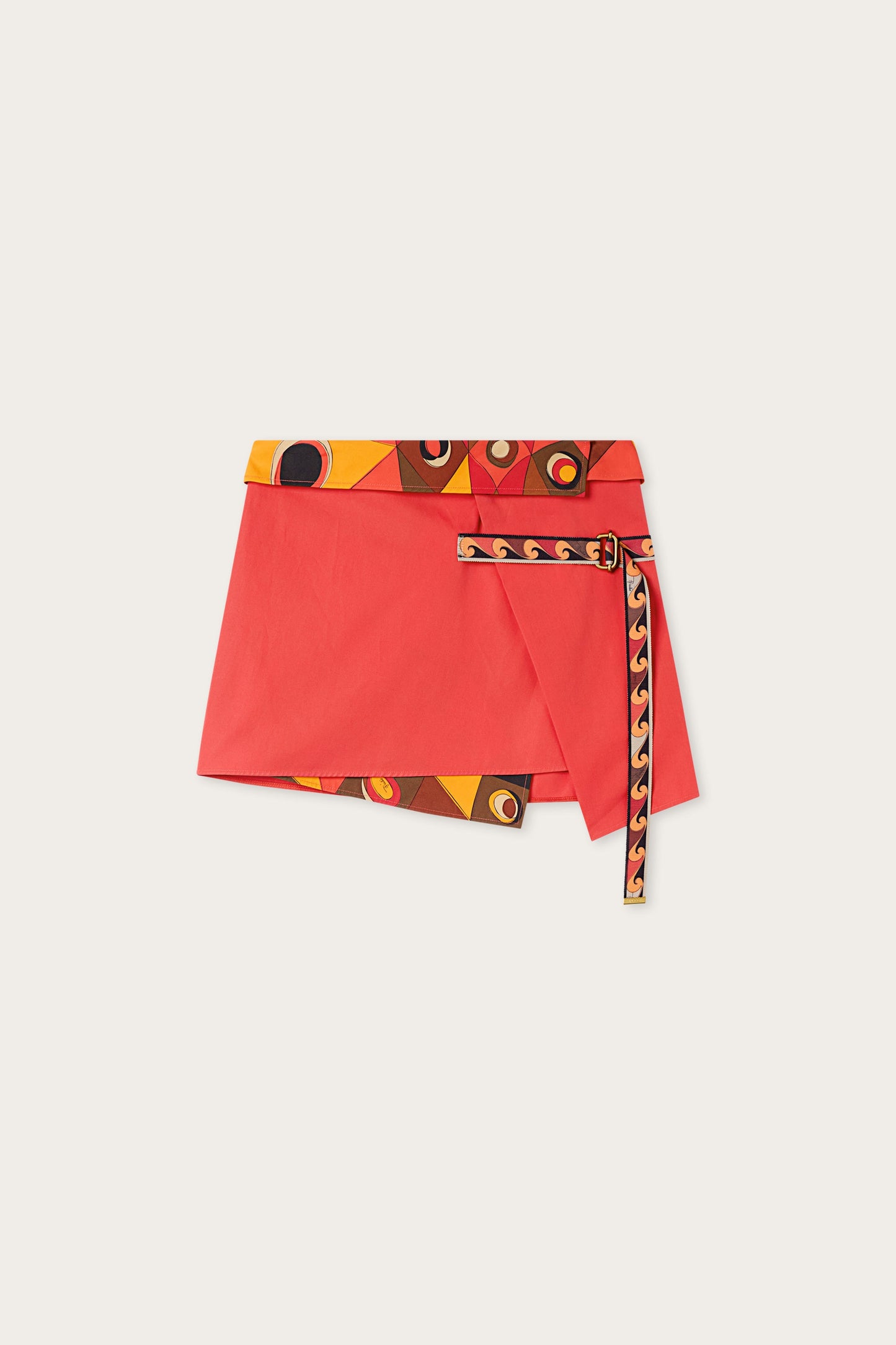 Una gonna a portafoglio dal taglio semplice seppur moderno, pensata per valorizzare la silhouette con una linea pulita e femminile. La chiusura in gros-grain stampato è rifinita da una fibbia in metallo con logo Pucci, dettaglio distintivo che unisce funzionalità e identità. Realizzata in tela di cotone, è un capo versatile e deciso, perfetto per look estivi sofisticati.