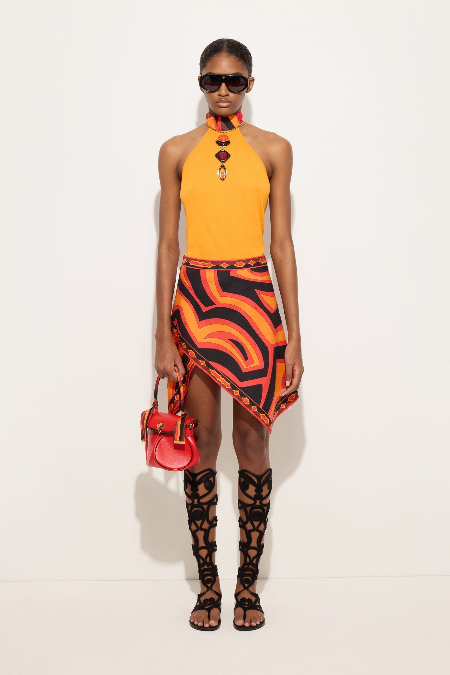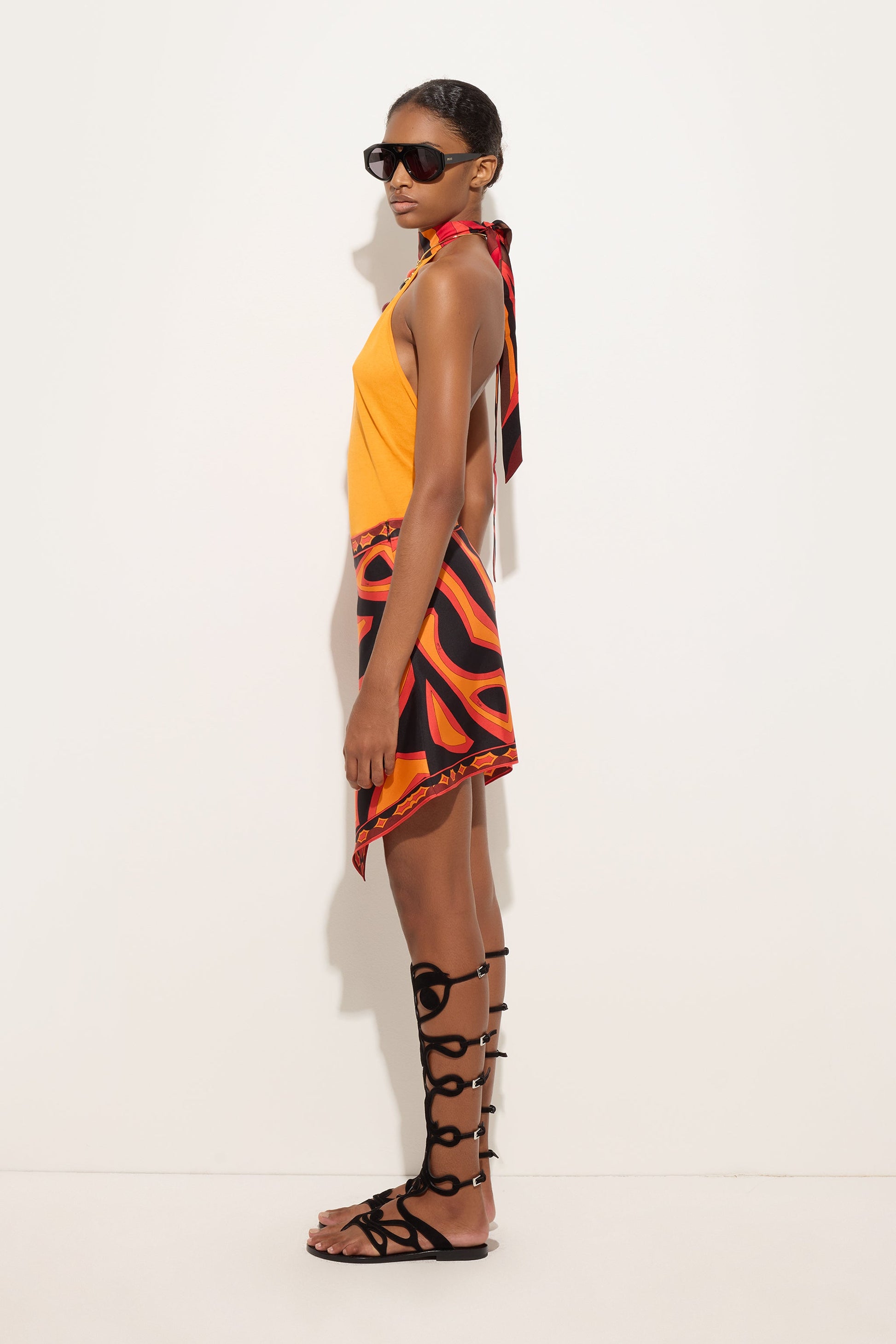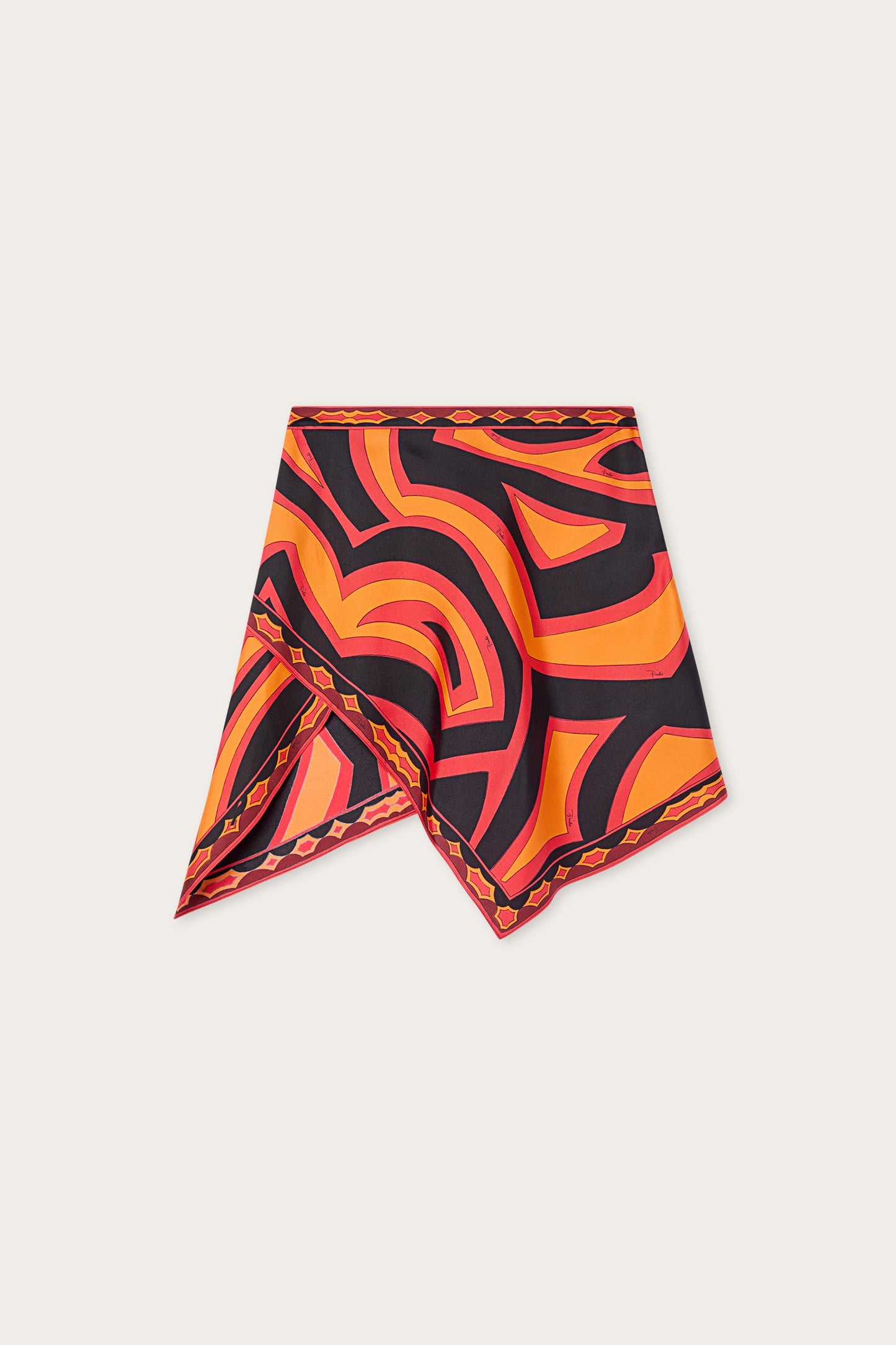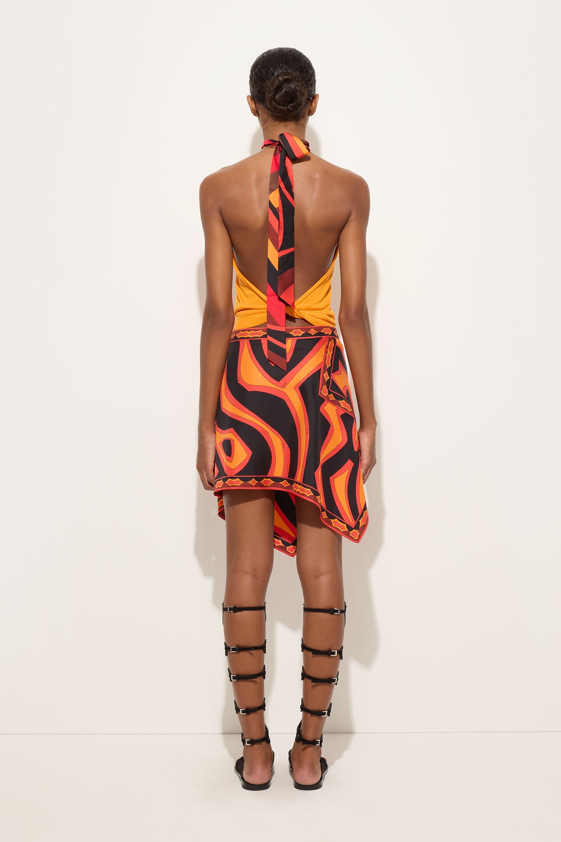 Una gonna fluida e raffinata che richiama l’estetica iconica dei foulard Pucci. Realizzata in twill di seta, avvolge il corpo con leggerezza, lasciando che la stampa Labirinto in arancio e nero si esprima con un ritmo elegante e continuo. La zip laterale mantiene la linea pulita e funzionale, valorizzando una silhouette essenziale ma ricercata. Un capo pensato per accompagnare il movimento con naturalezza, dove colore e materia dialogano in perfetto equilibrio.