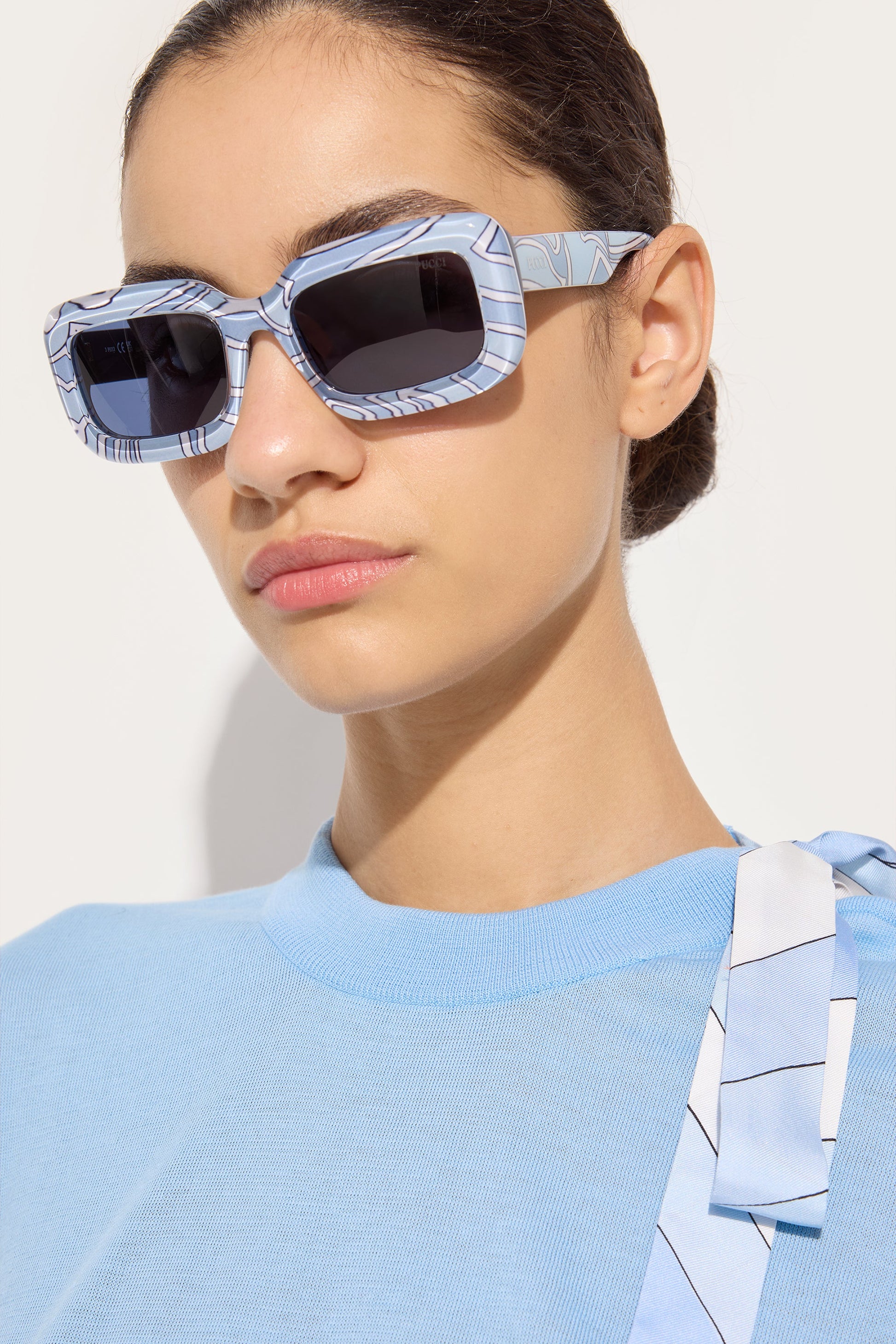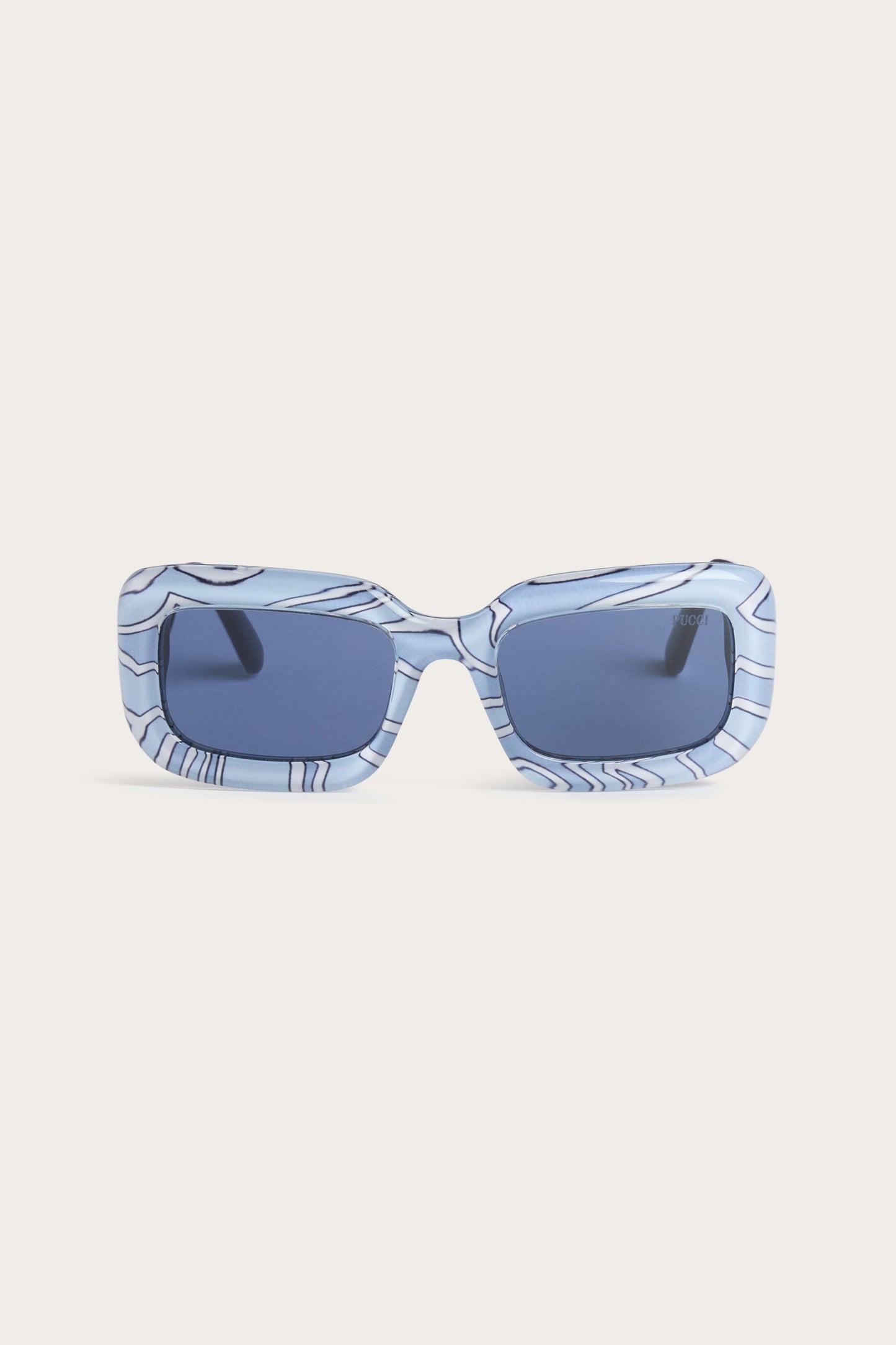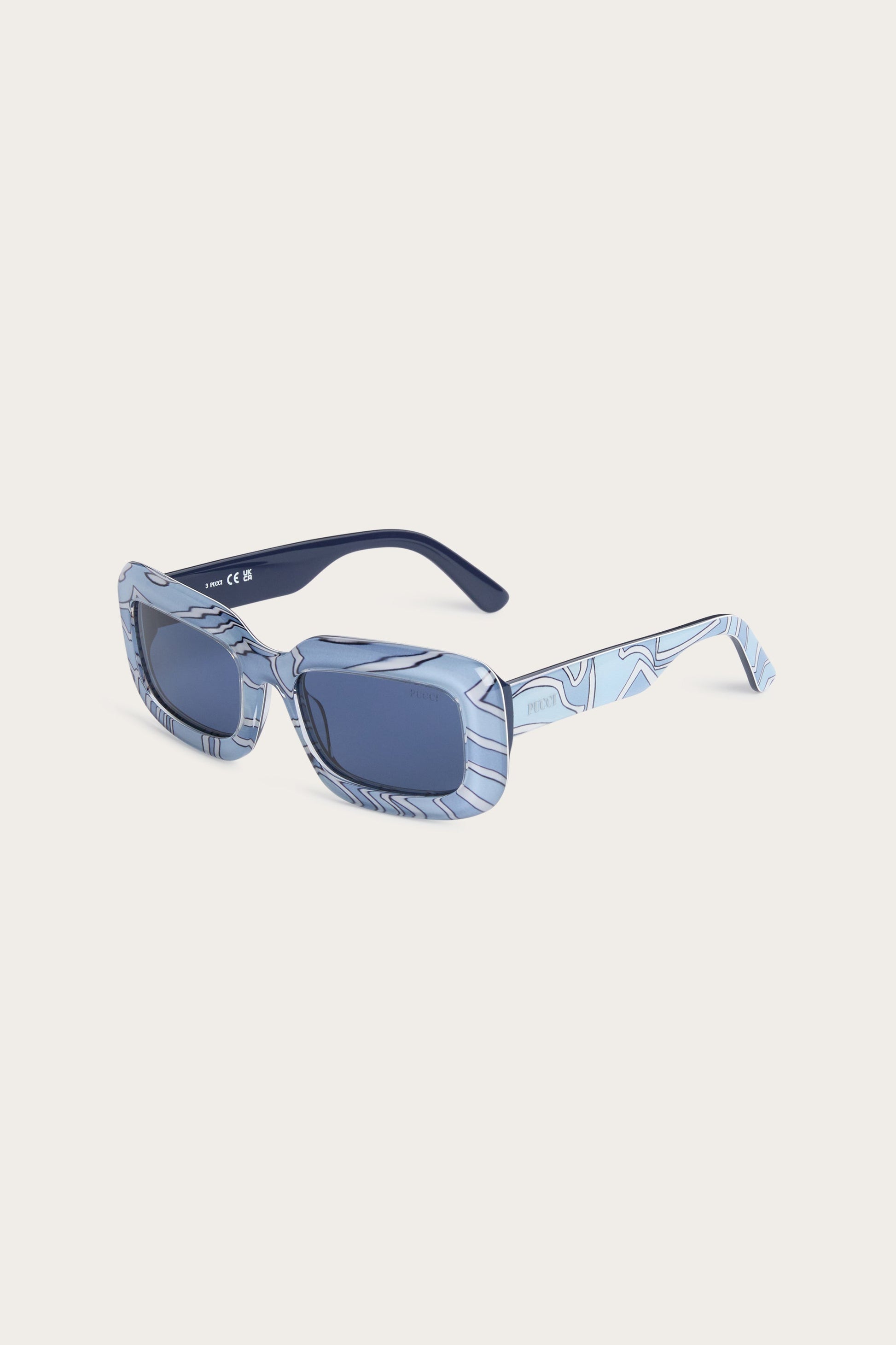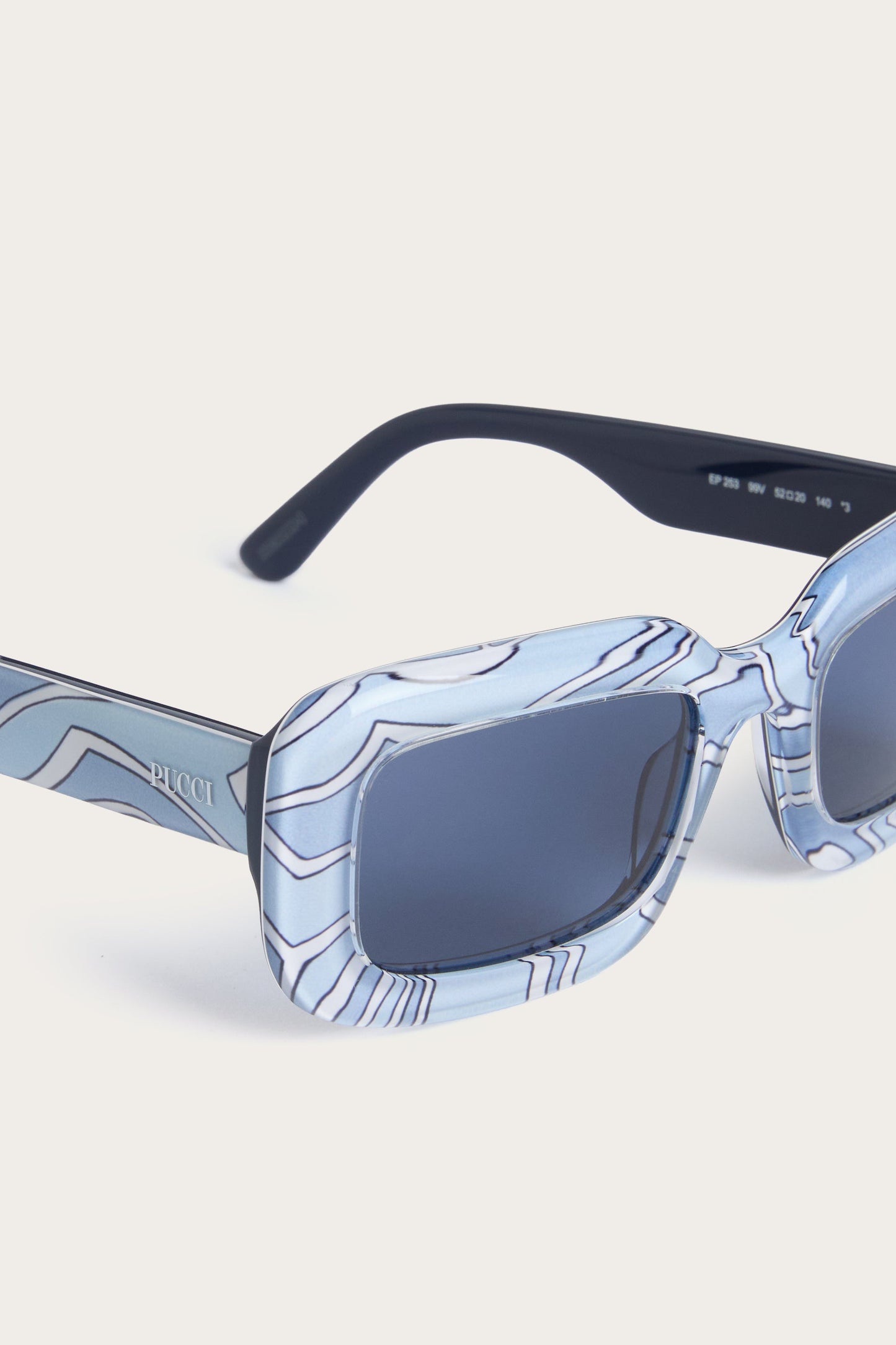 Un modello dal carattere deciso che interpreta lo spirito vibrante Pucci con linee pulite e contemporanee. La montatura rettangolare in acetato definisce lo sguardo con un’estetica audace e iconica, mentre la parte frontale leggermente bombata aggiunge profondità al design. Le aste sottili, rifinite con il logo Pucci, creano un elegante contrasto e rendono l’occhiale estremamente versatile tra uso casual e "professionale".
