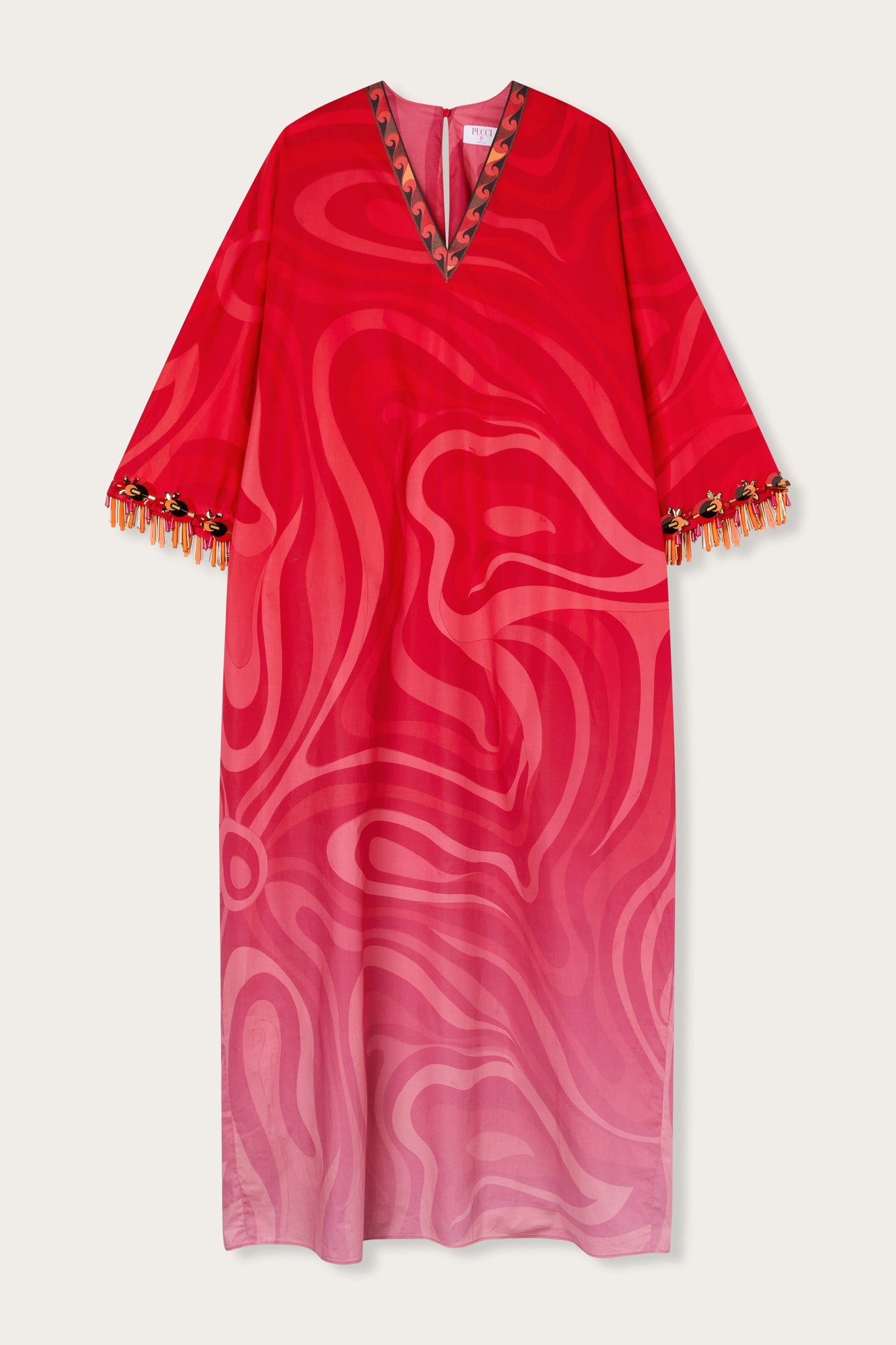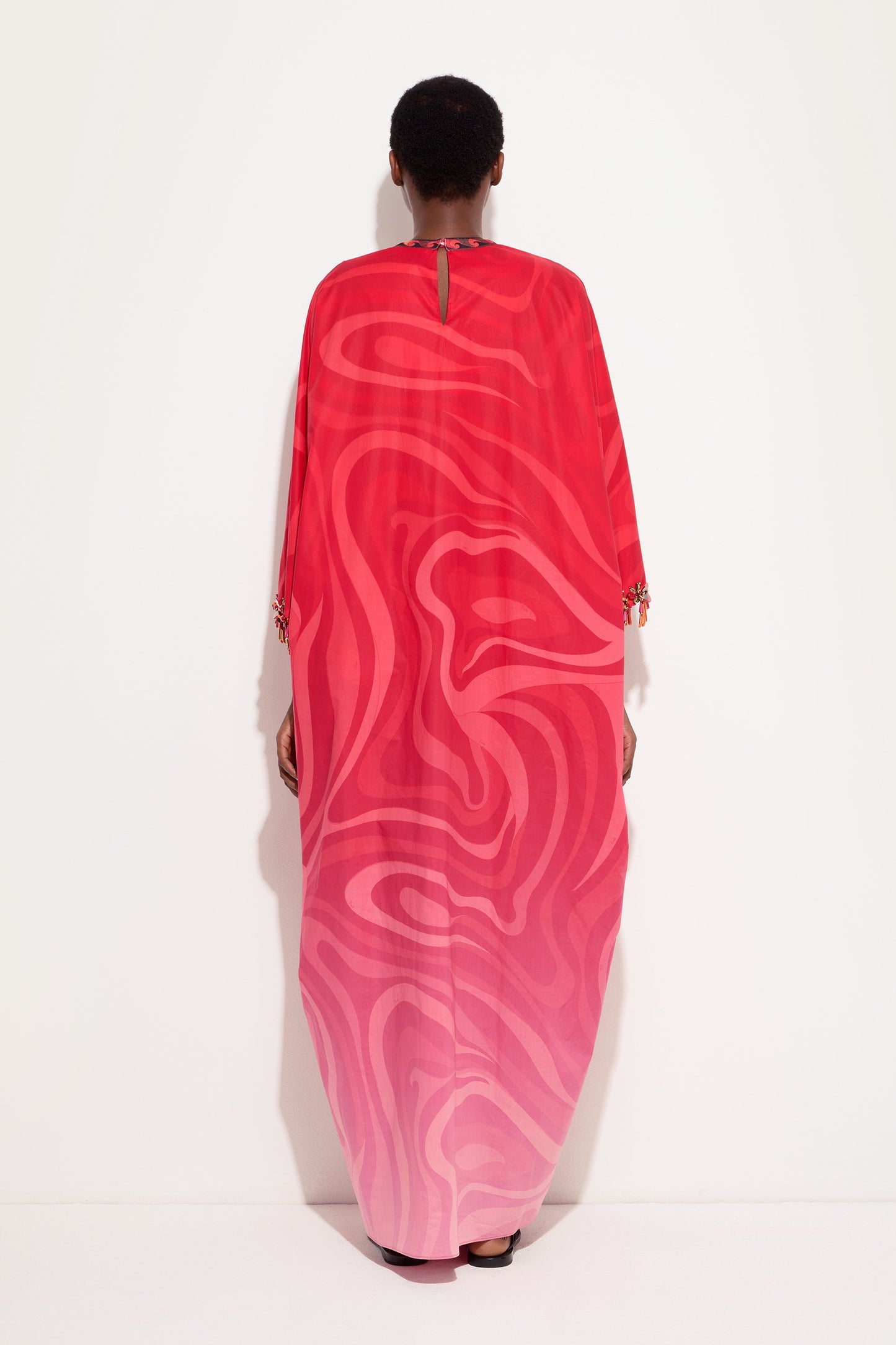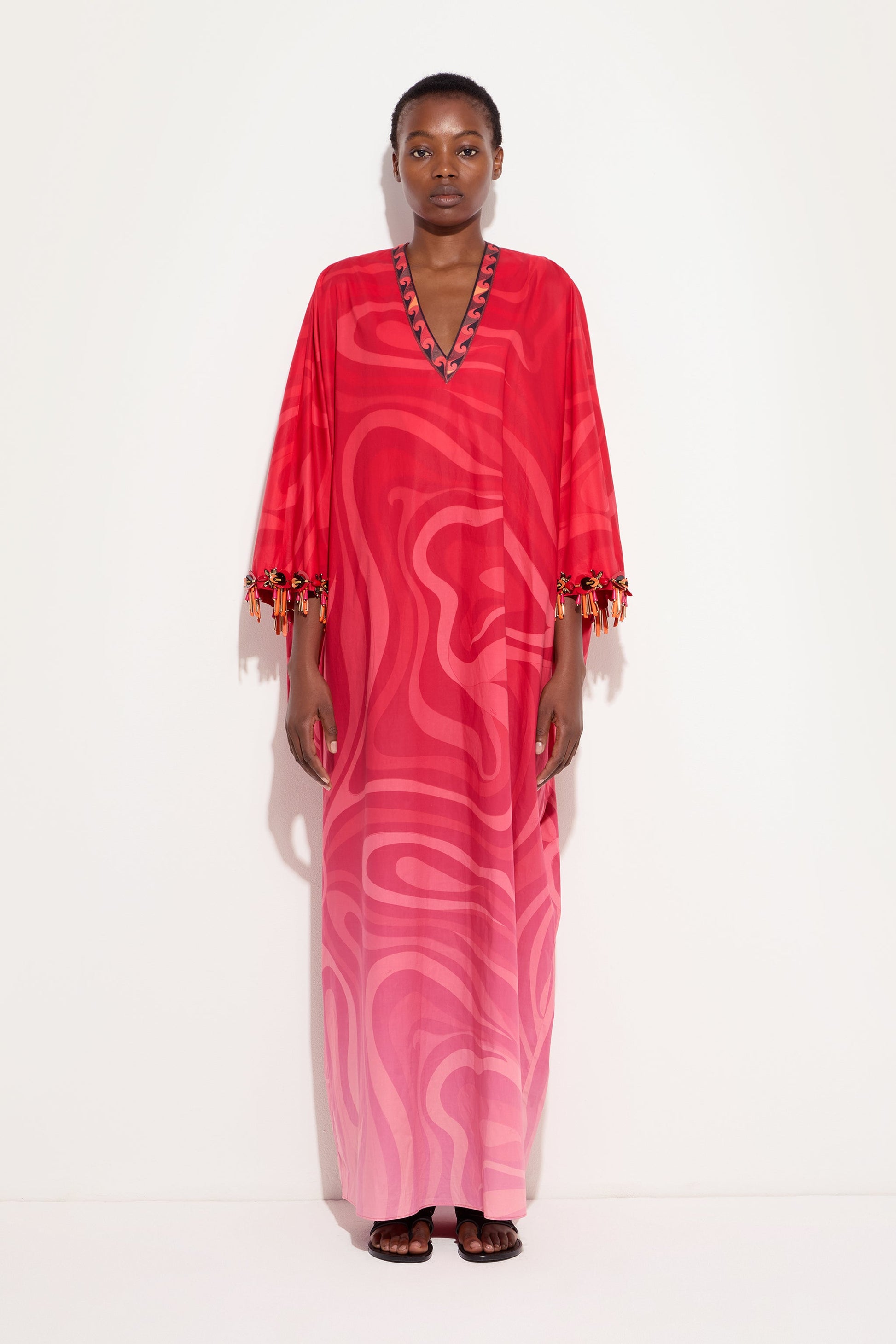 Un caftano lungo dal forte impatto visivo, dove leggerezza e decorazione si incontrano in un equilibrio sofisticato. Lo scollo a V sul davanti è impreziosito da un ricamo tridimensionale realizzato con un mix di materiali: cristalli, paillettes, legno e metallo, che crea un bordo ricco e giocoso. L’effetto Marmo degradé amplifica la profondità cromatica del capo, mentre la costruzione in popeline di cotone garantisce freschezza e fluidità.