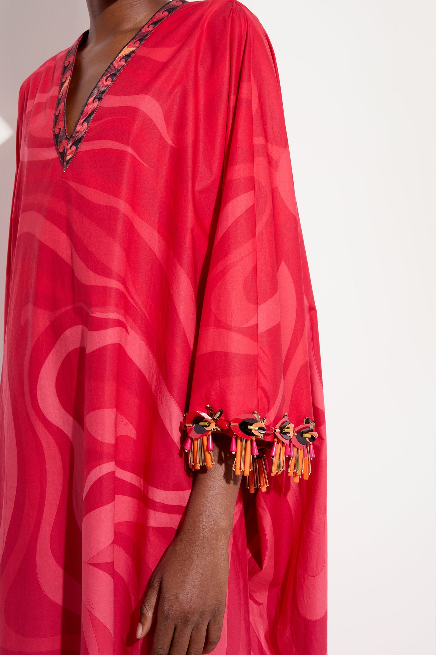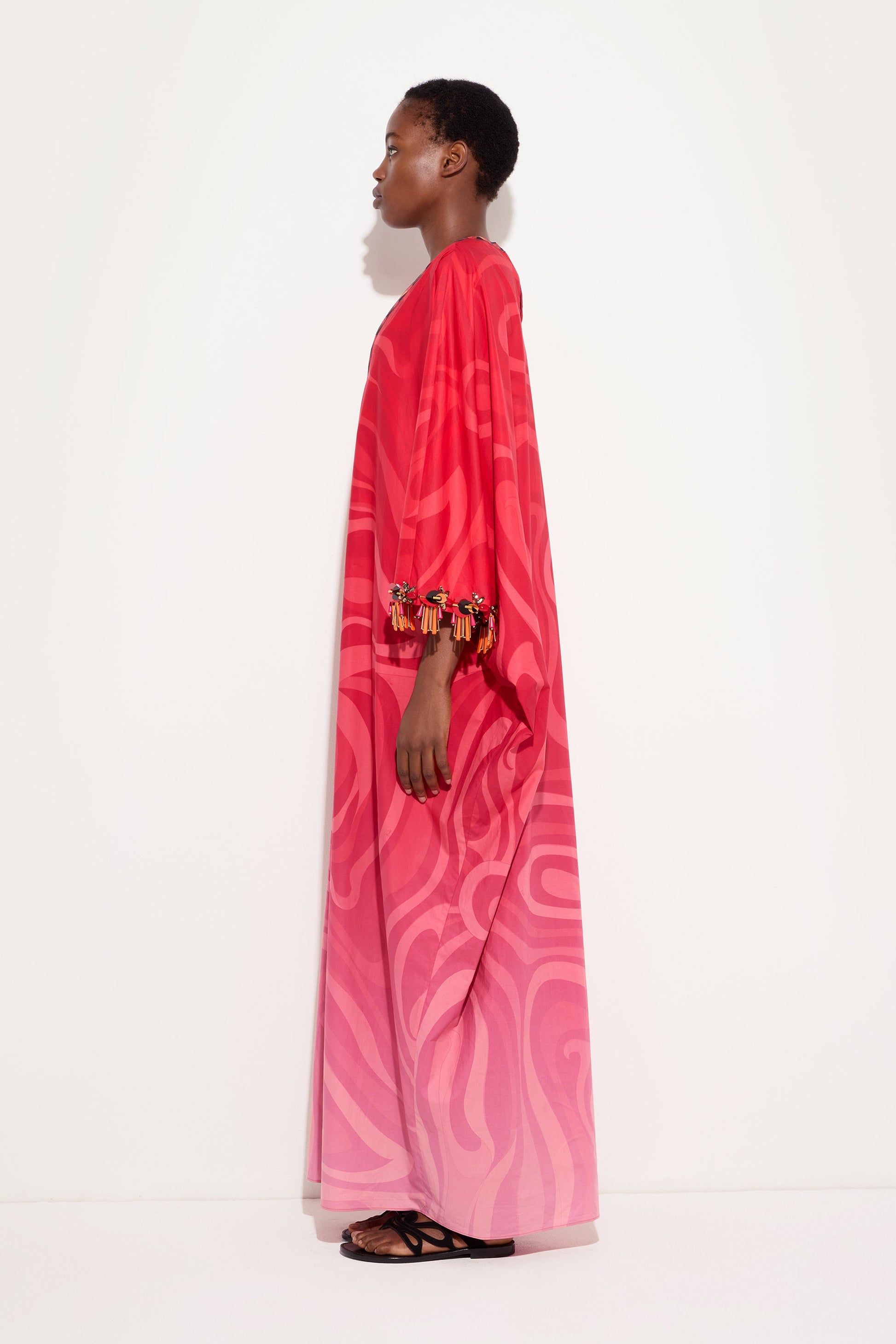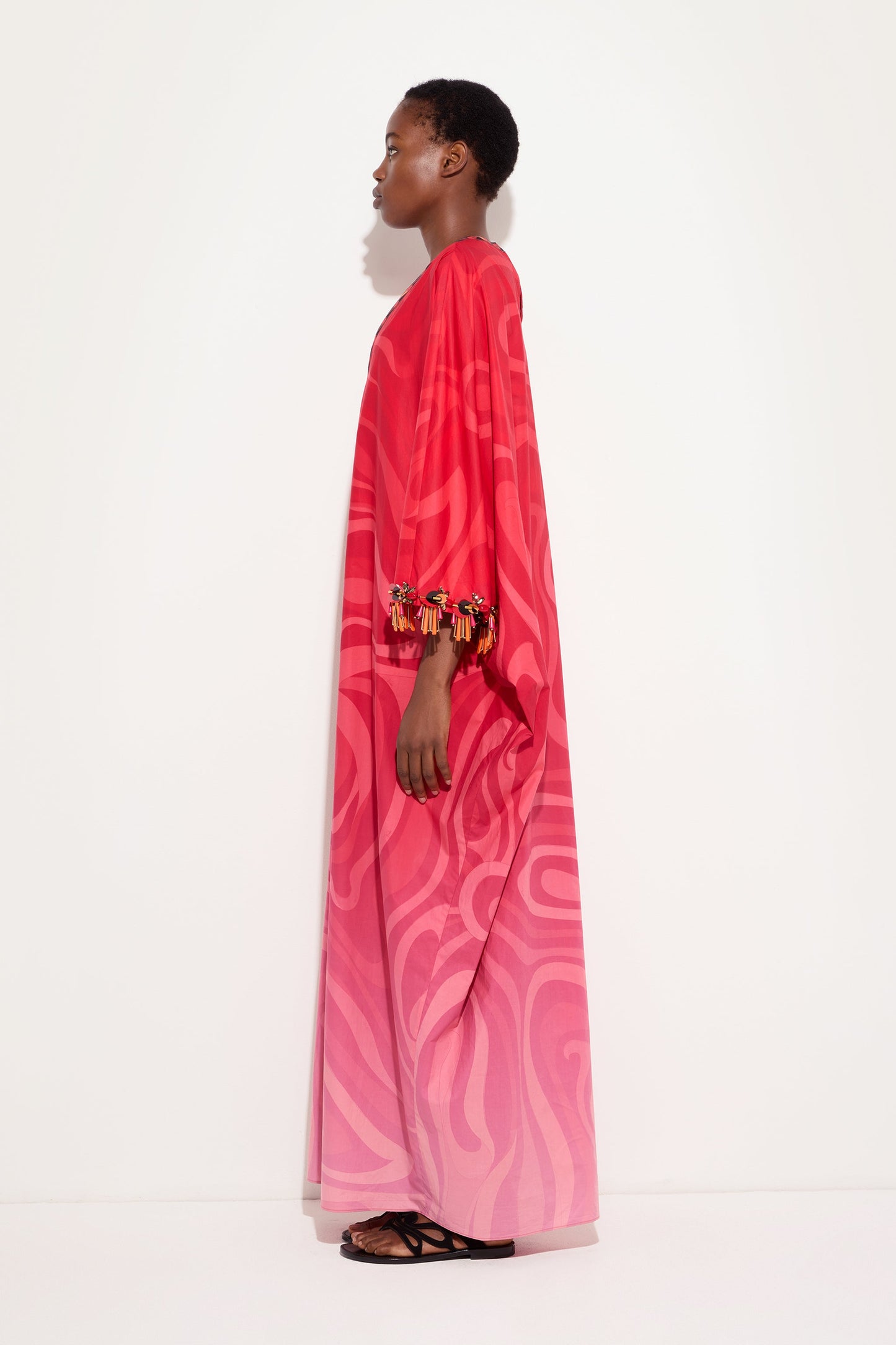Un caftano lungo dal forte impatto visivo, dove leggerezza e decorazione si incontrano in un equilibrio sofisticato. Lo scollo a V sul davanti è impreziosito da un ricamo tridimensionale realizzato con un mix di materiali: cristalli, paillettes, legno e metallo, che crea un bordo ricco e giocoso. L’effetto Marmo degradé amplifica la profondità cromatica del capo, mentre la costruzione in popeline di cotone garantisce freschezza e fluidità.