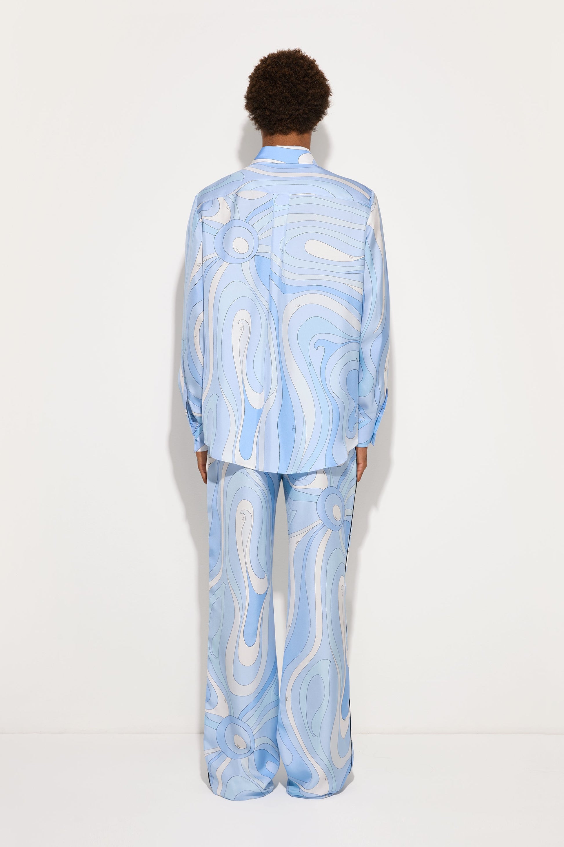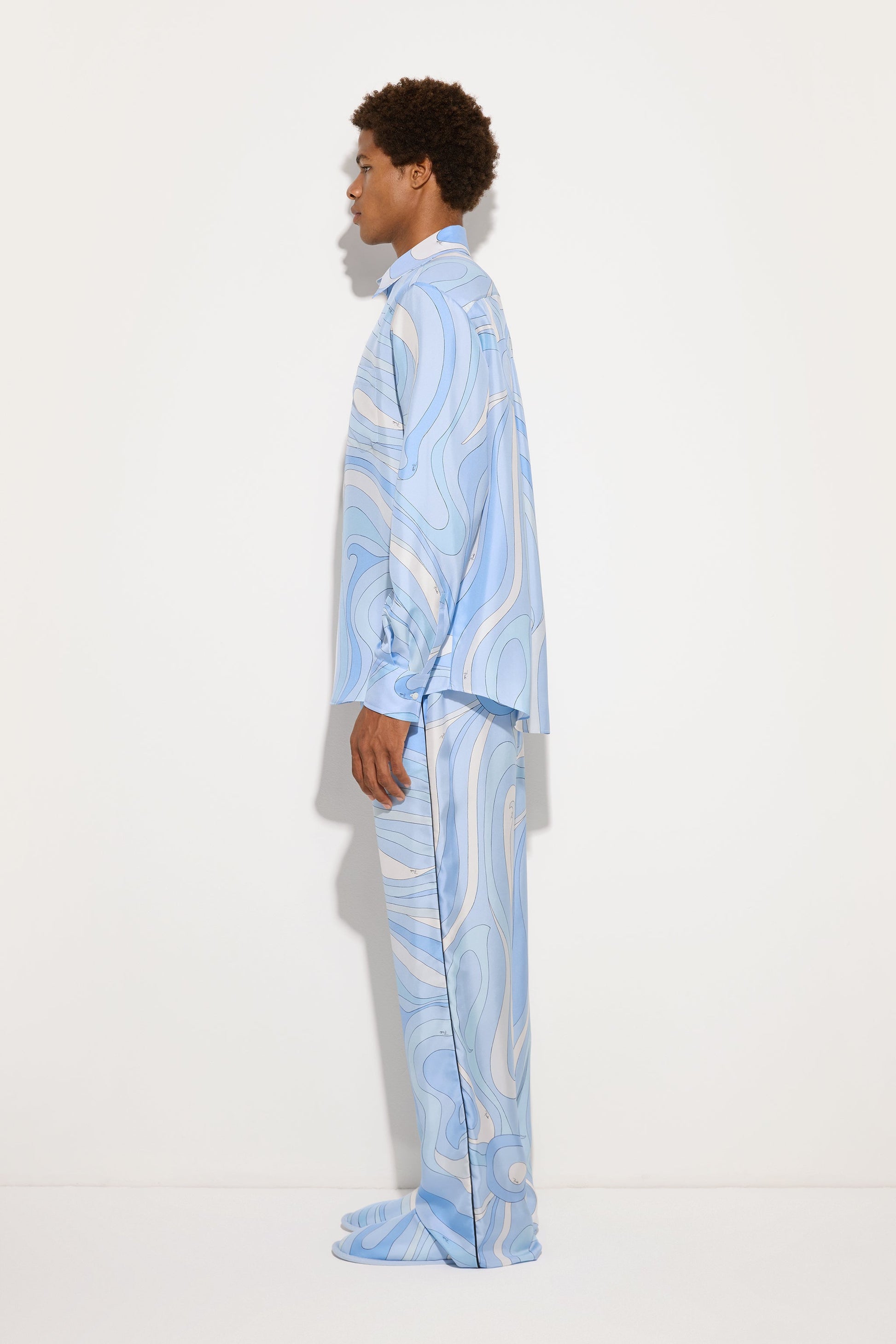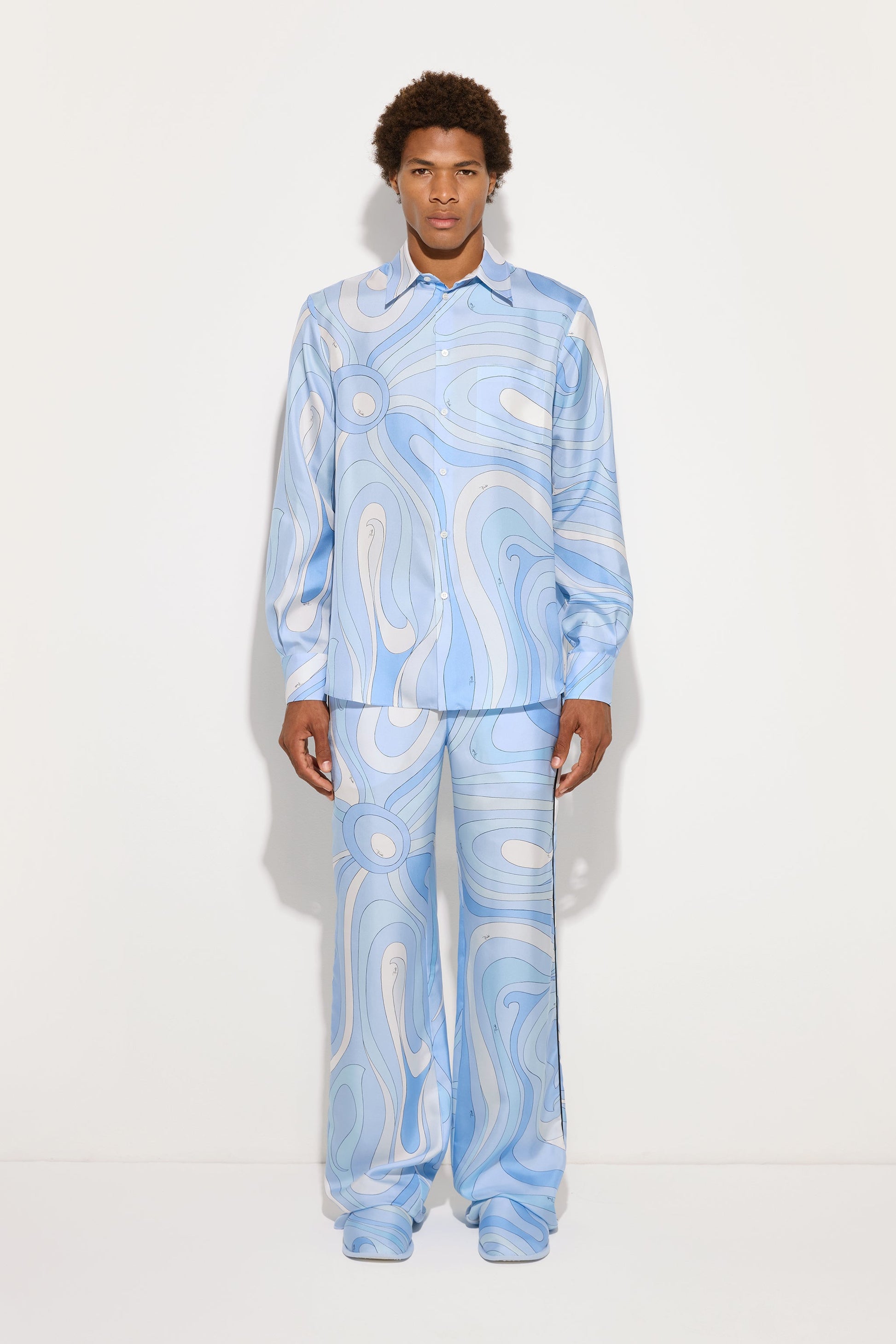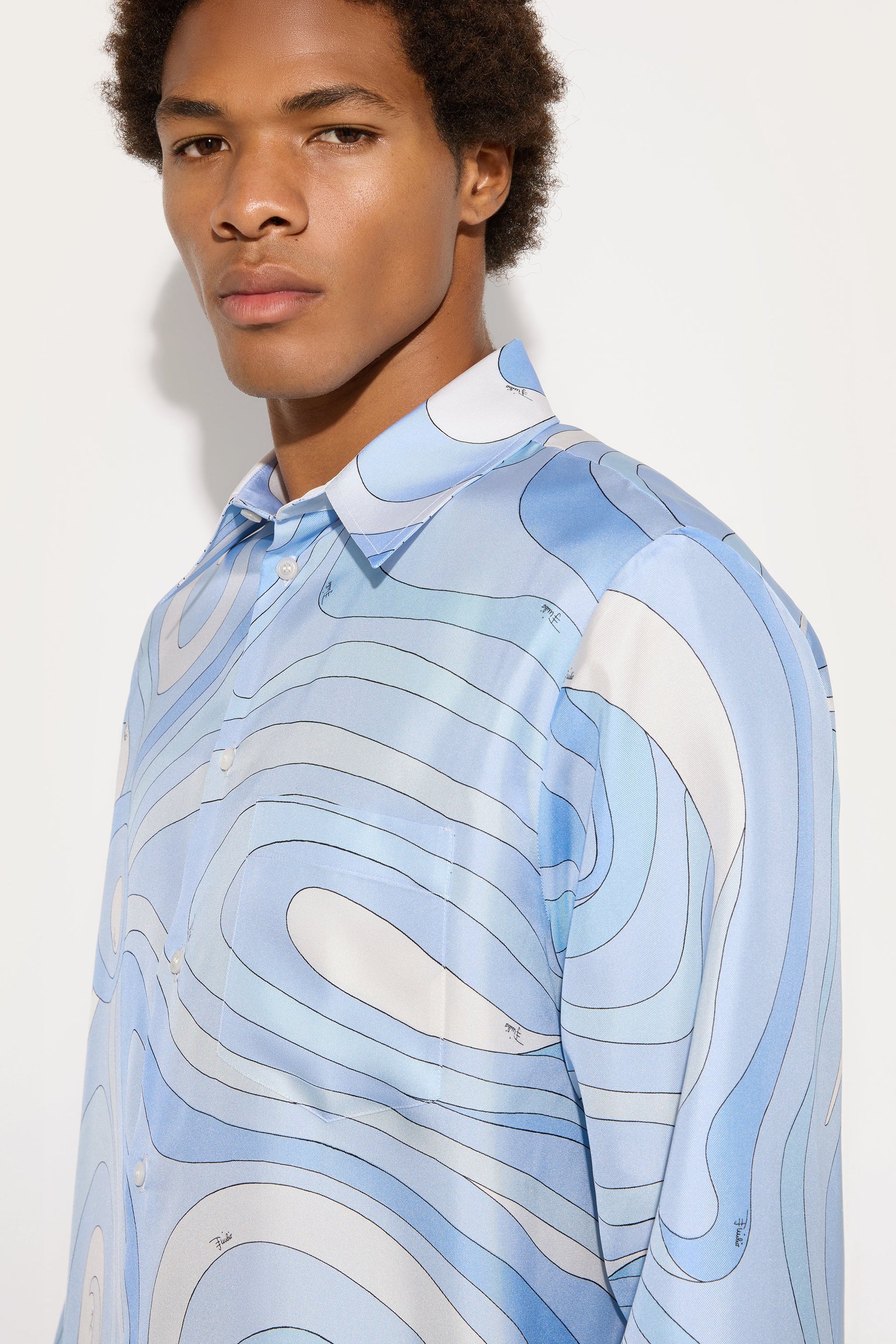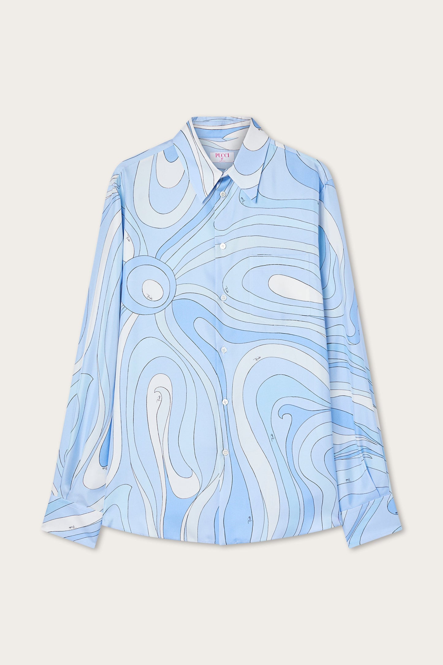 Una camicia dal carattere fluido e contemporaneo, pensata per essere indossata con naturalezza e libertà. Realizzata in twill di seta, presenta una vestibilità oversize e confortevole che accompagna il movimento con leggerezza. La stampa Marmo, declinata in celeste, anima la superficie con un ritmo morbido e luminoso, esaltando la fluidità del tessuto. Un capo versatile e inclusivo, concepito per entrare con disinvoltura sia nel guardaroba maschile che in quello femminile.