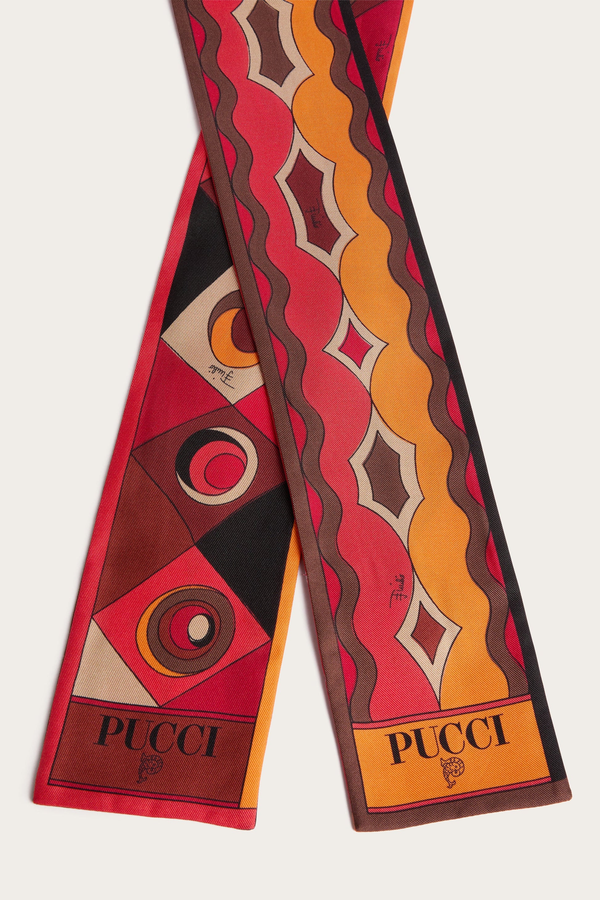 Il mix di iconiche stampe nei toni di arancio e nero aggiunge un contrasto raffinato, perfetto per completare sia look casual che formali con un tocco distintivo. Un accessorio leggero e sofisticato che si adatta a ogni occasione.