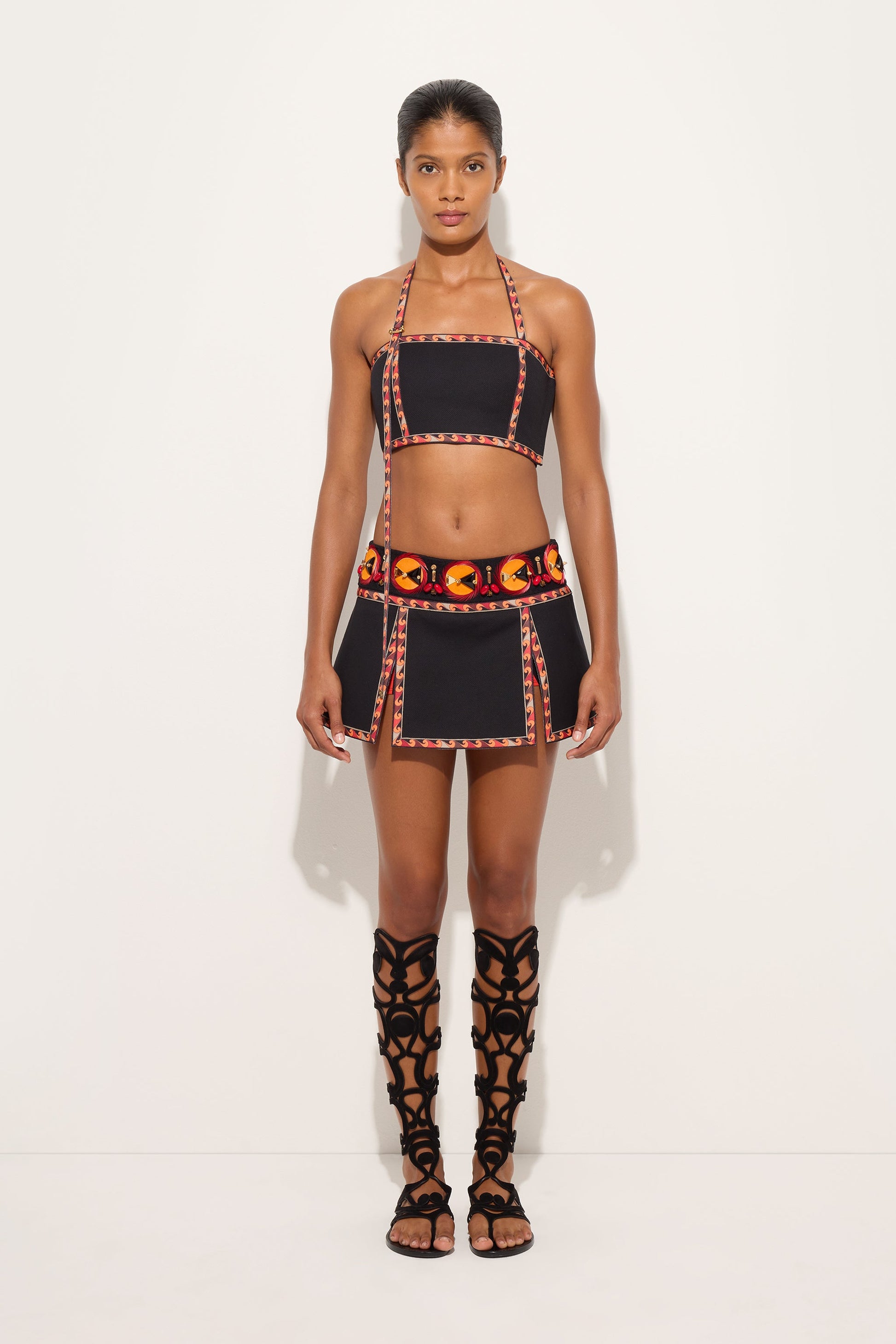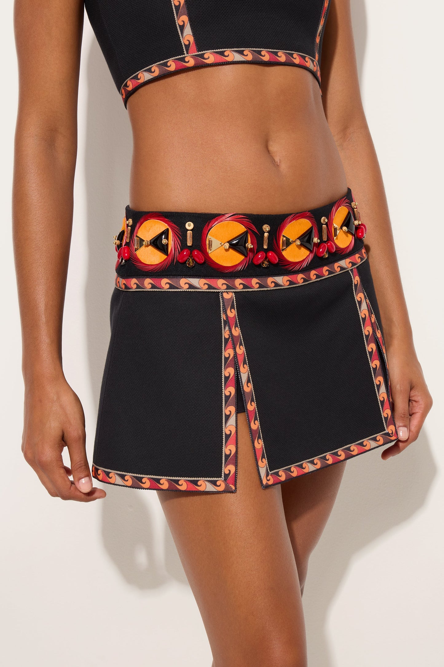 Una gonna dal carattere deciso, dove struttura sartoriale e dettagli preziosi si incontrano. I risvolti frontali e gli orli rifiniti in gros-grain definiscono una linea pulita e contemporanea, mentre la zip laterale mantiene il design essenziale. In vita, la cintura gioiello ricamata diventa protagonista, aggiungendo tridimensionalità e luce al capo. Realizzata in cotone piquet con fodera interna, è pensata per look sofisticati e distintivi.