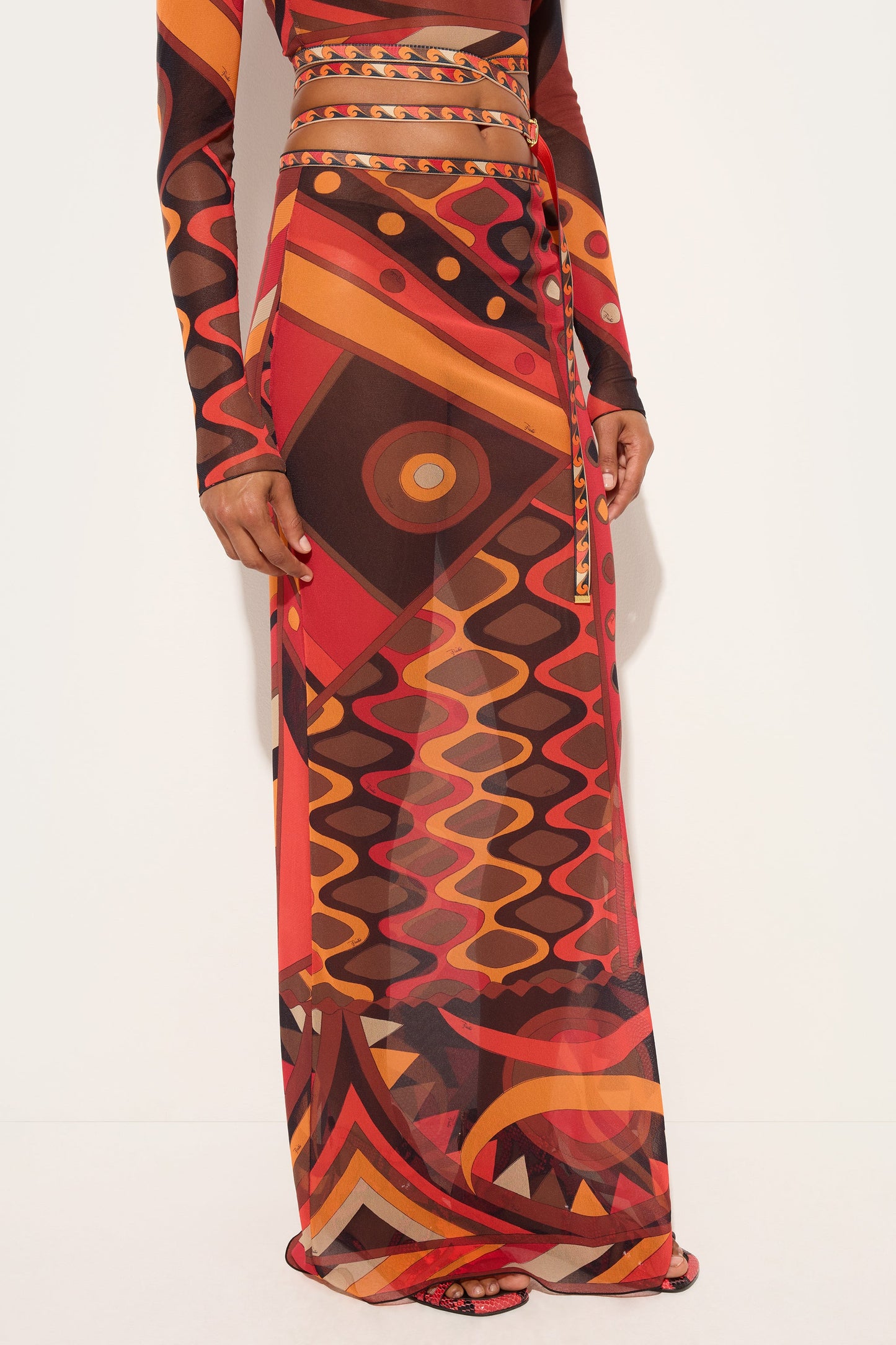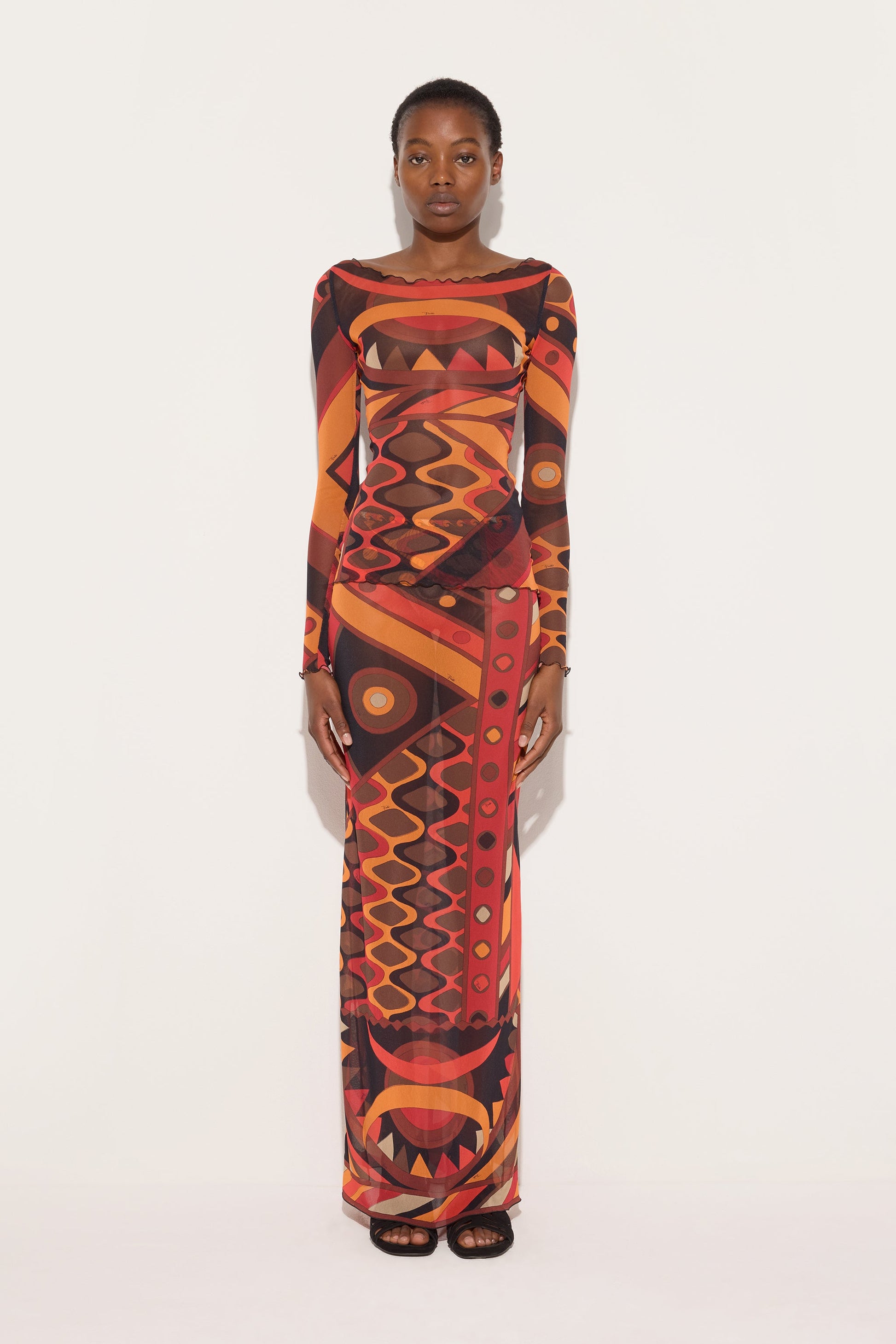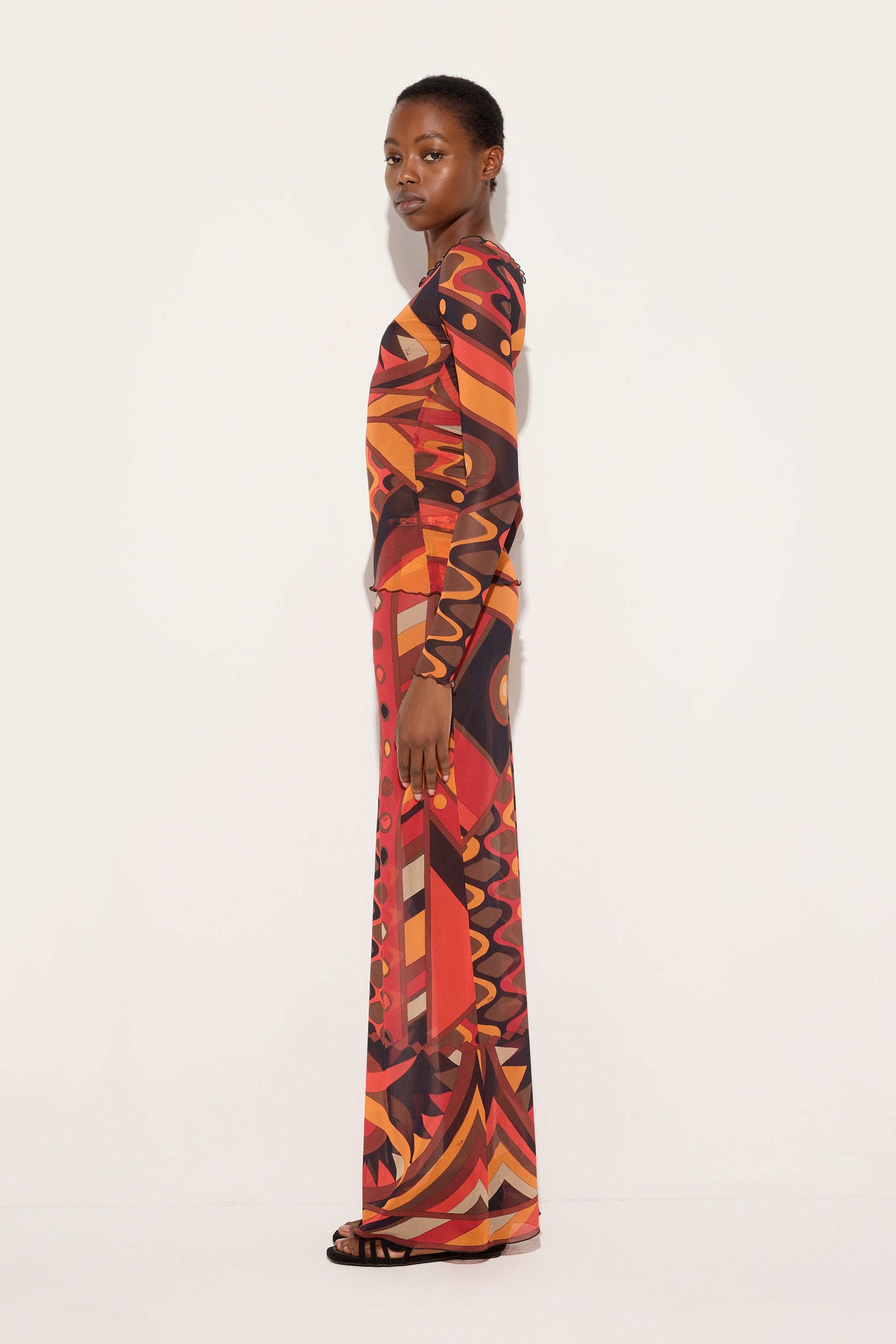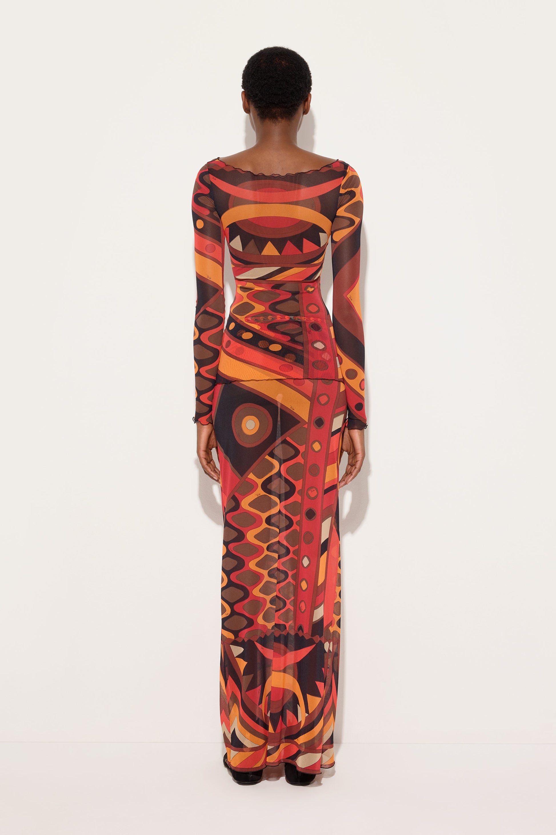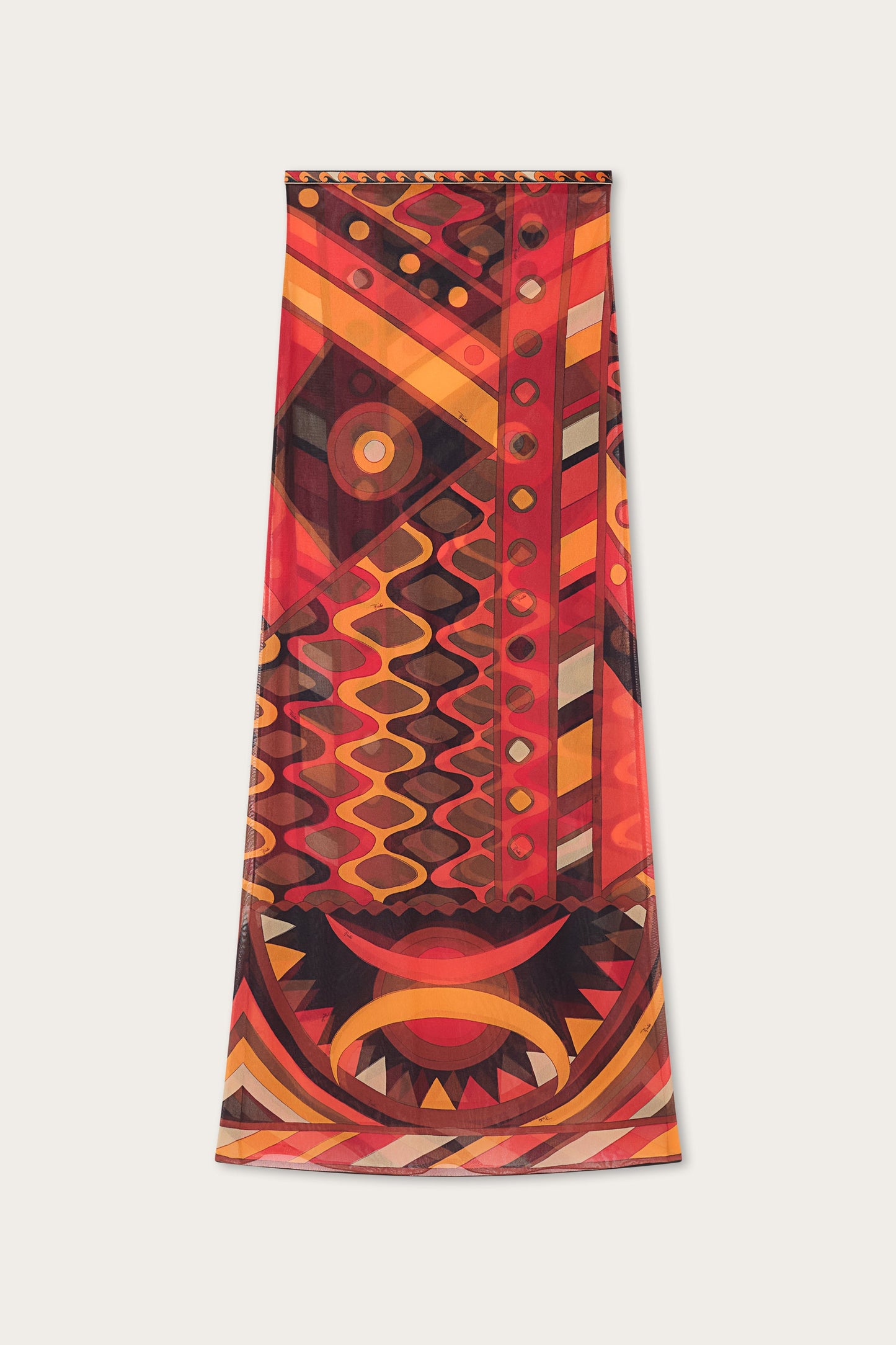 Una gonna eterea e dinamica che mette in scena il movimento attraverso la trasparenza del tulle. La silhouette è definita da un elastico in vita stampato, che assicura comfort e una vestibilità naturale, mentre la stampa Vivara nei toni di arancio e nero attraversa il capo con un ritmo fluido e vibrante.
